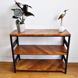 Voici une belle étagère réalisée sur mesure pour Claire. Comme la table basse qui l’accompagne, celle-ci a été réalisée en parquet en chêne massif point de Hongrie recyclé et upcyclé. Finitions : Le sens…
