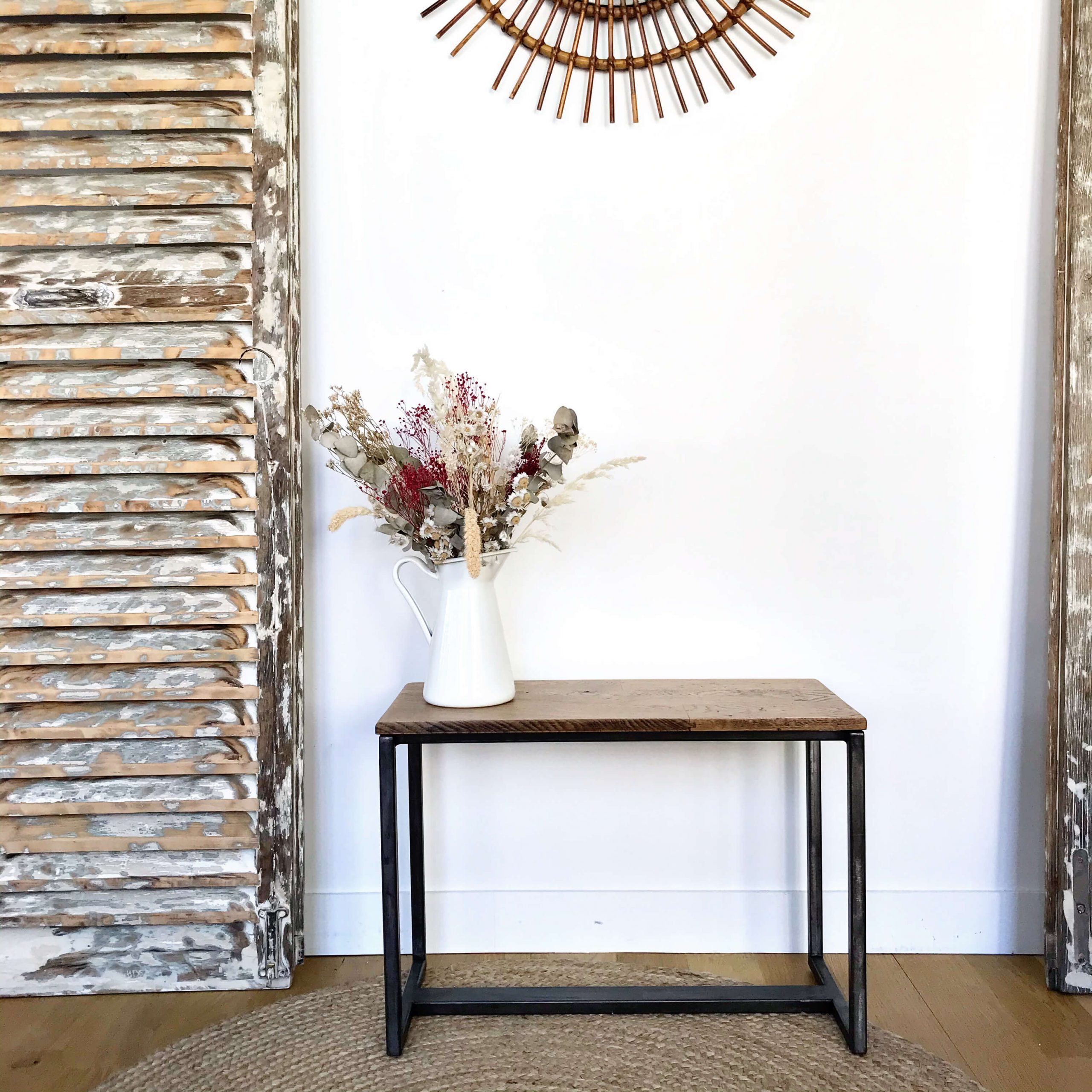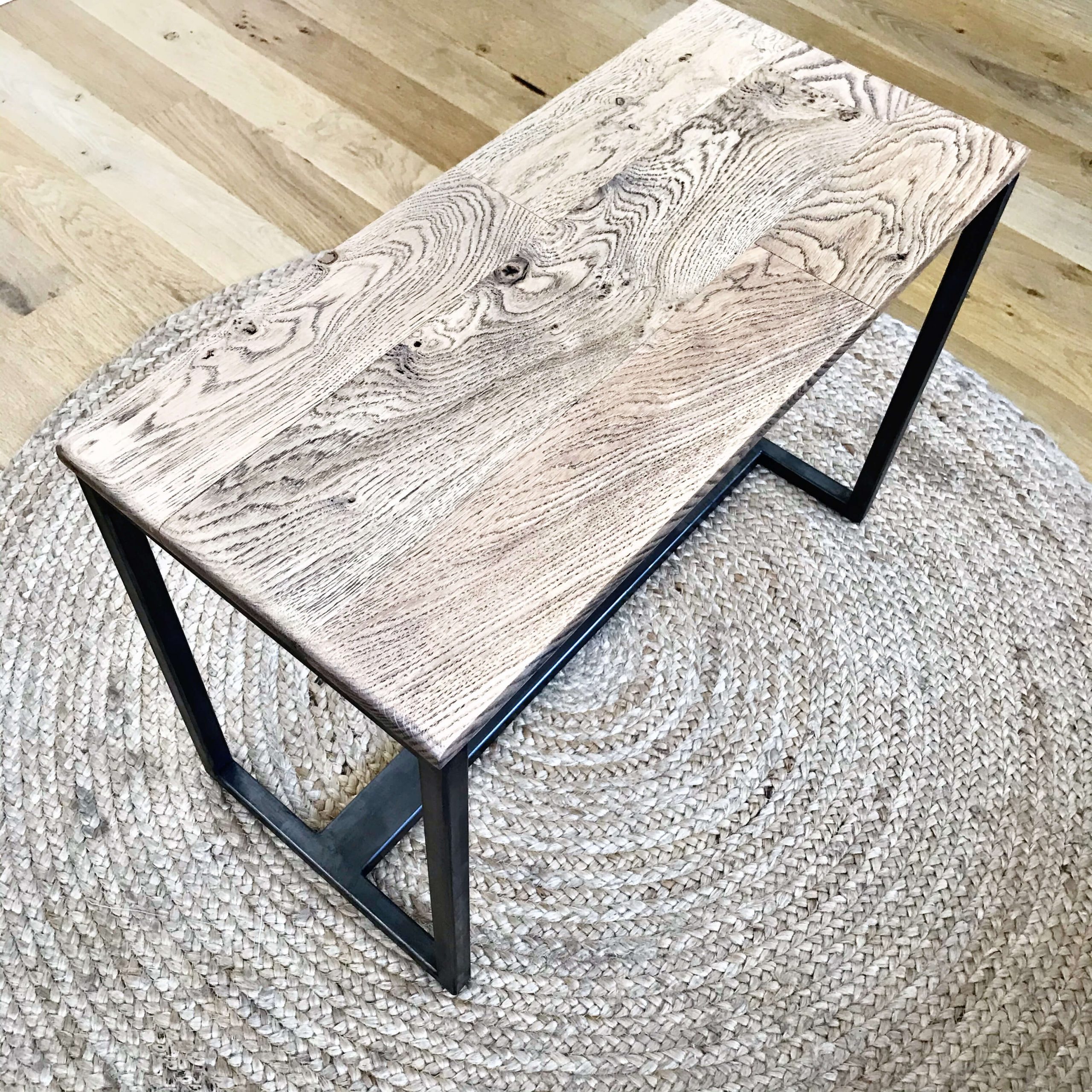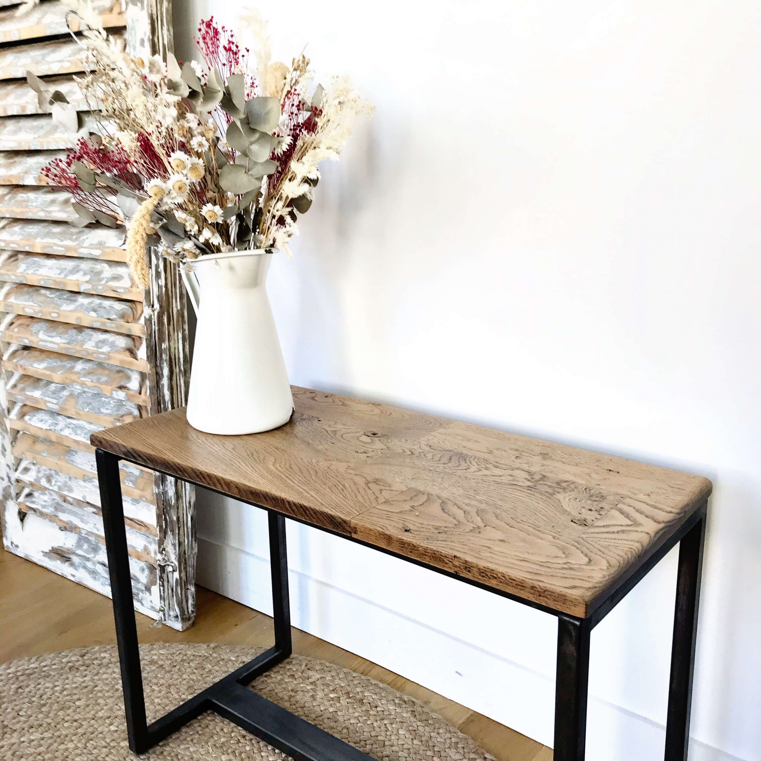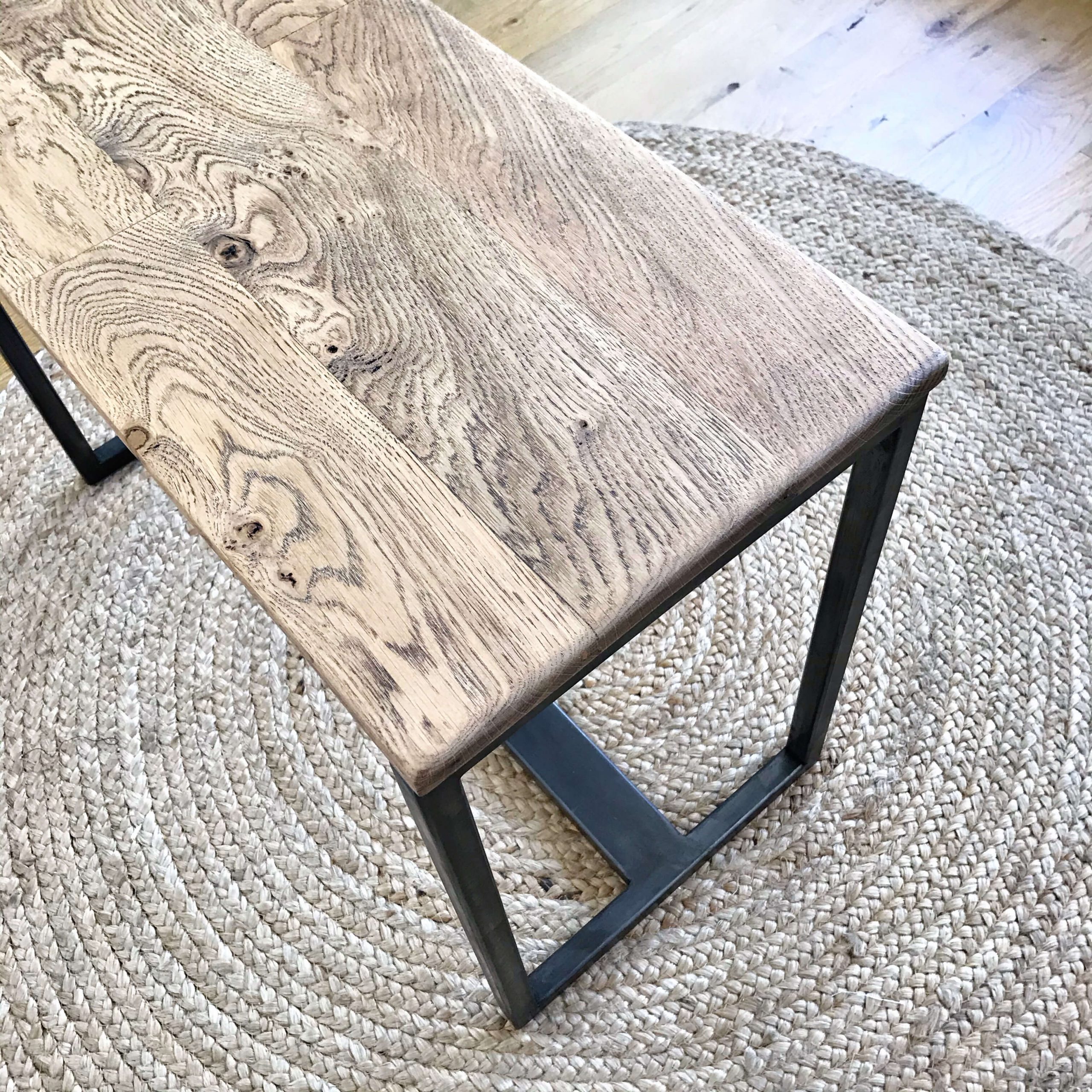 Le piètement est en acier et le bois est du chêne massif recyclé.