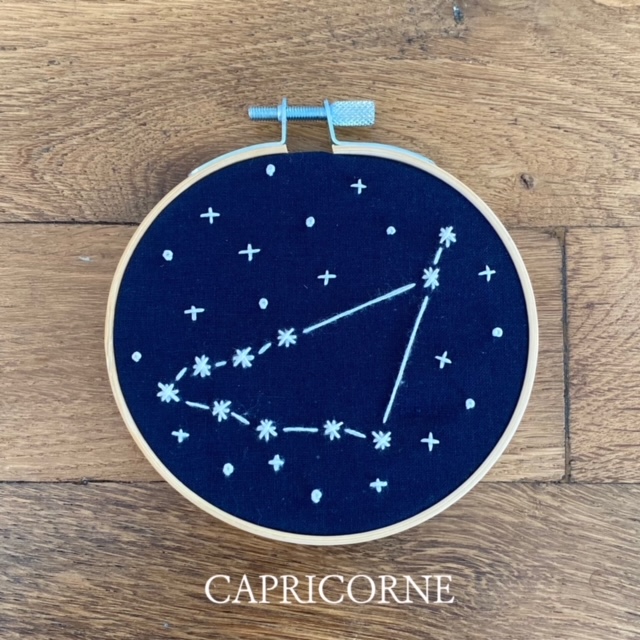 Les étoiles sont brodées sur une toile de coton de satin bleu avec un fil à broder qui brille dans la nuit. A accrocher, ou à poser elle trouvera facilement sa place dans une chambre, une entrée ou votre salon.