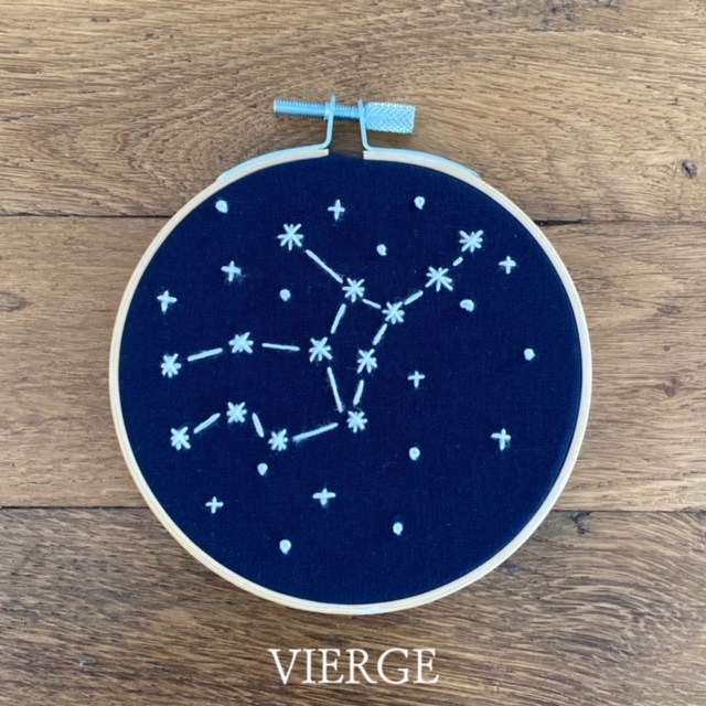 Les étoiles sont brodées sur une toile de coton de satin bleu avec un fil à broder qui brille dans la nuit. A accrocher, ou à poser elle trouvera facilement sa place dans une chambre, une entrée ou votre salon.