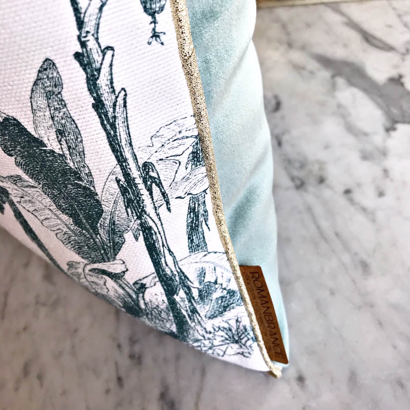 Ce coussin est joliment souligné d’un passepoil doré clair.