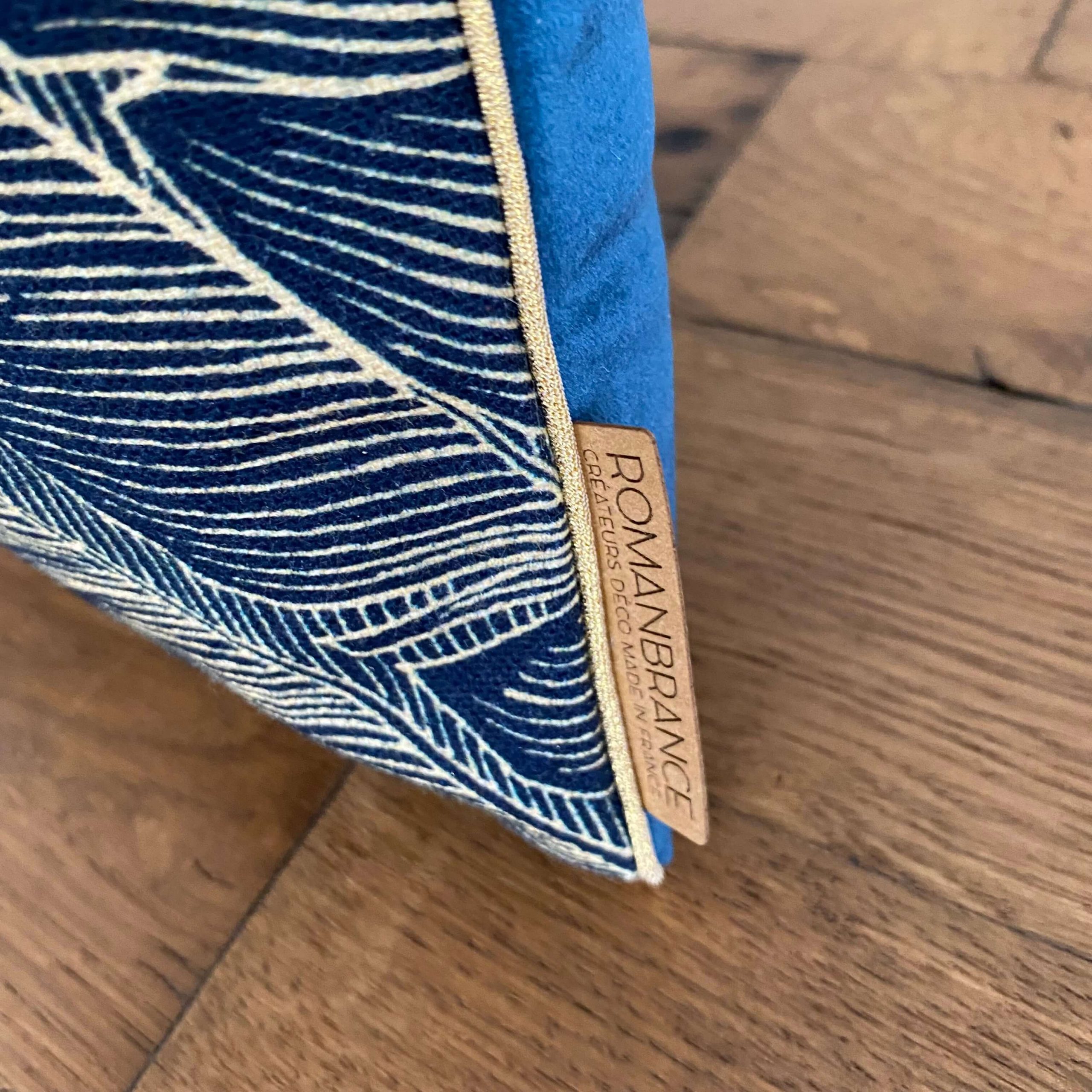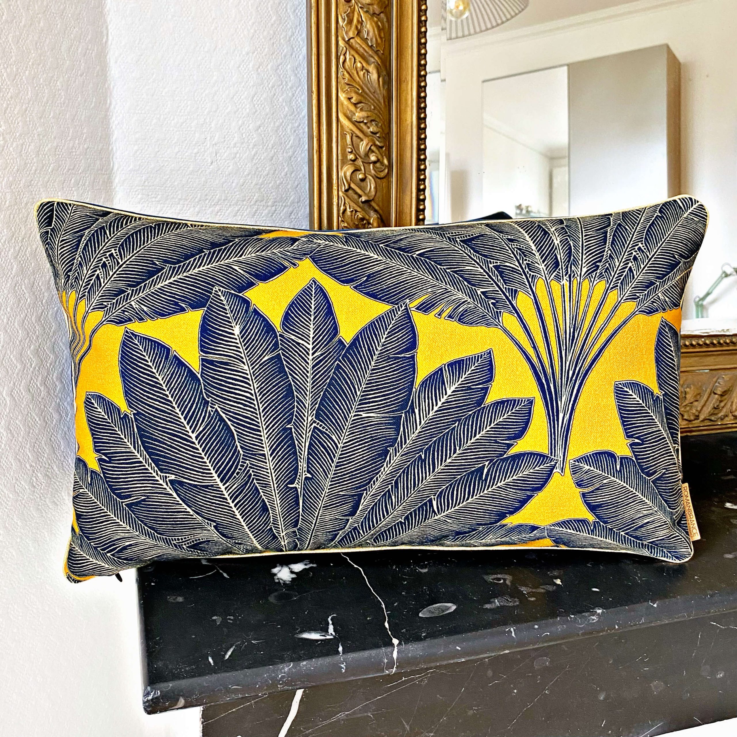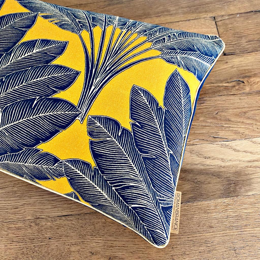 Véritable invitation aux voyages, craquez pour notre nouveau coussin BLUE BAY. Ces arbres du voyageur sur fond safran illumineront votre intérieur en apportant chaleur et dynamisme. Nous l’avons associé à un velours bleu nuit.