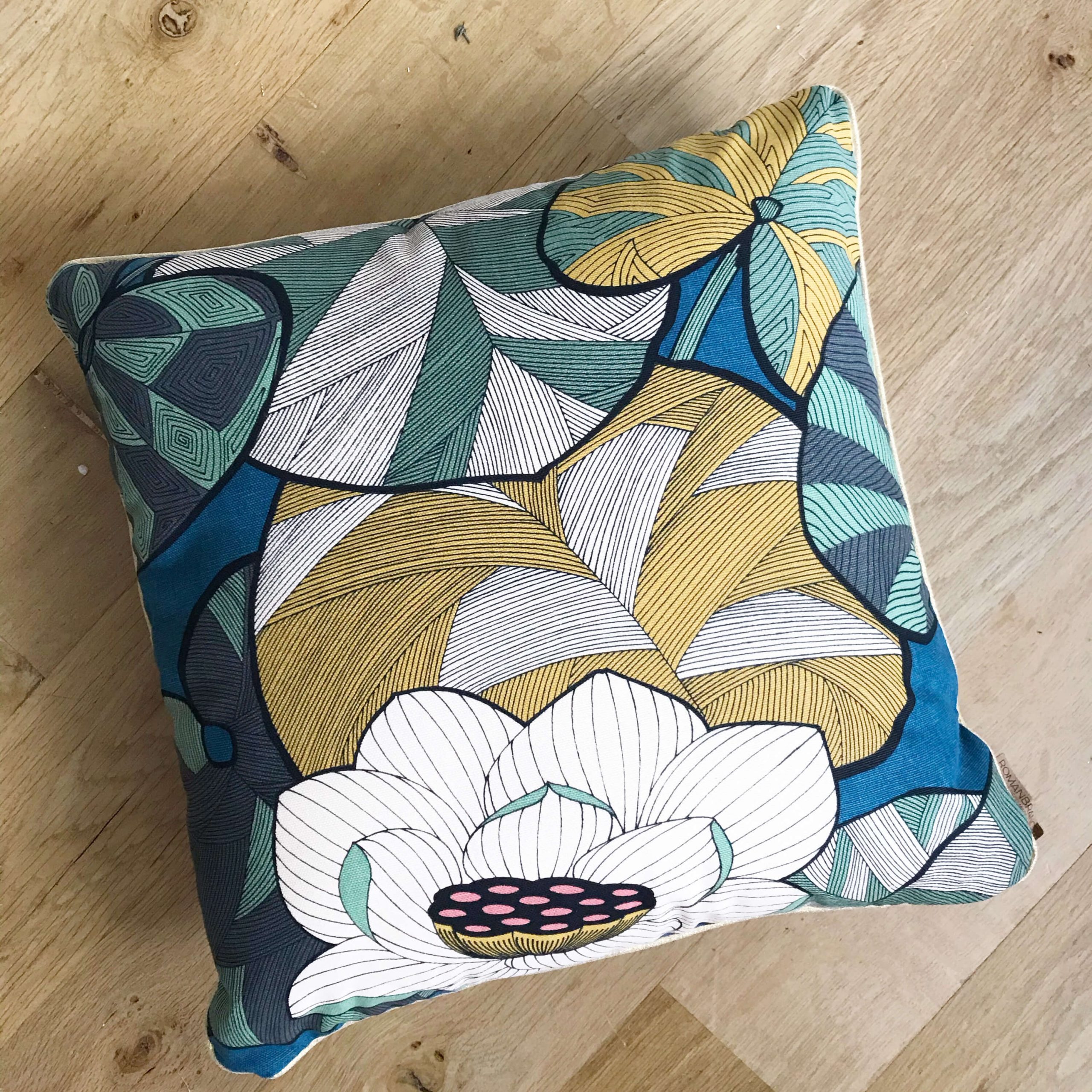 Laissez vous charmer par notre coussin IDRIS. Ces maxi nénuphars aux feuillages remplis de graphismes linéaire apporteront une touche d’exotisme et de vintage à votre intérieur.