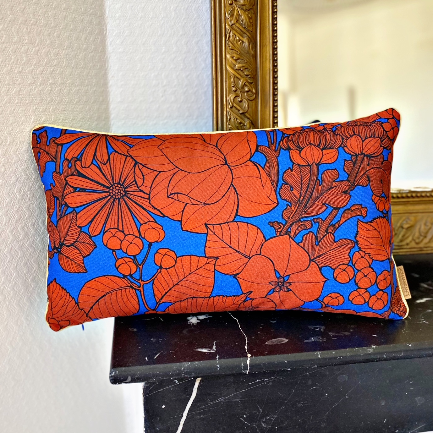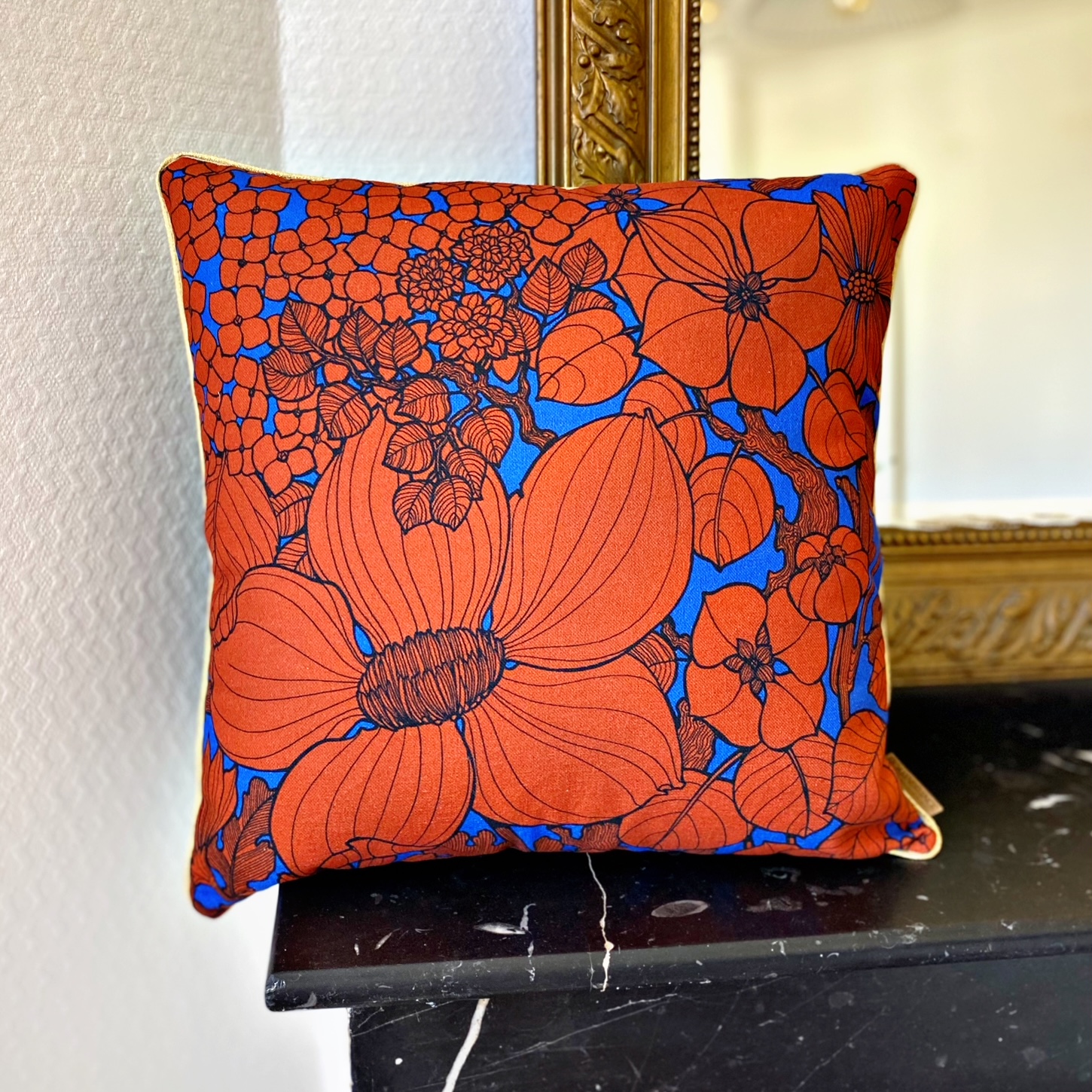 Pimentez votre intérieur avec notre nouveau coussin LAURETTE. On adore ce superbe tissus avec ses grandes fleurs rouille sur fond bleu. Nous avons choisi de le marier à un velours tout doux au verso.