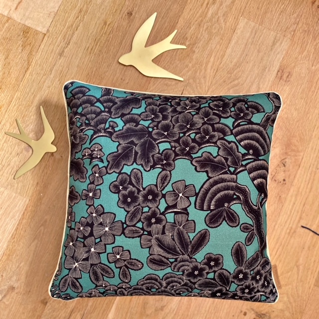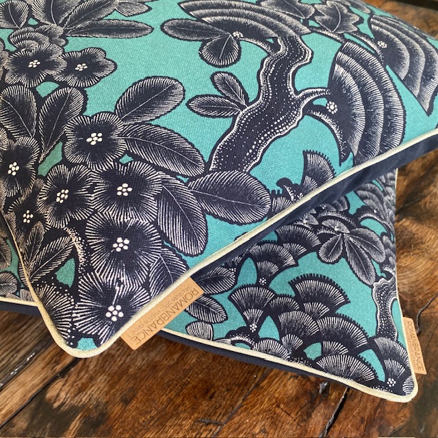 Apportez une touche d’élégance à votre intérieur avec notre coussin Maï. Son fond bleu paon lumineux met en valeur ses motifs floraux aux lignes fines et poétique.