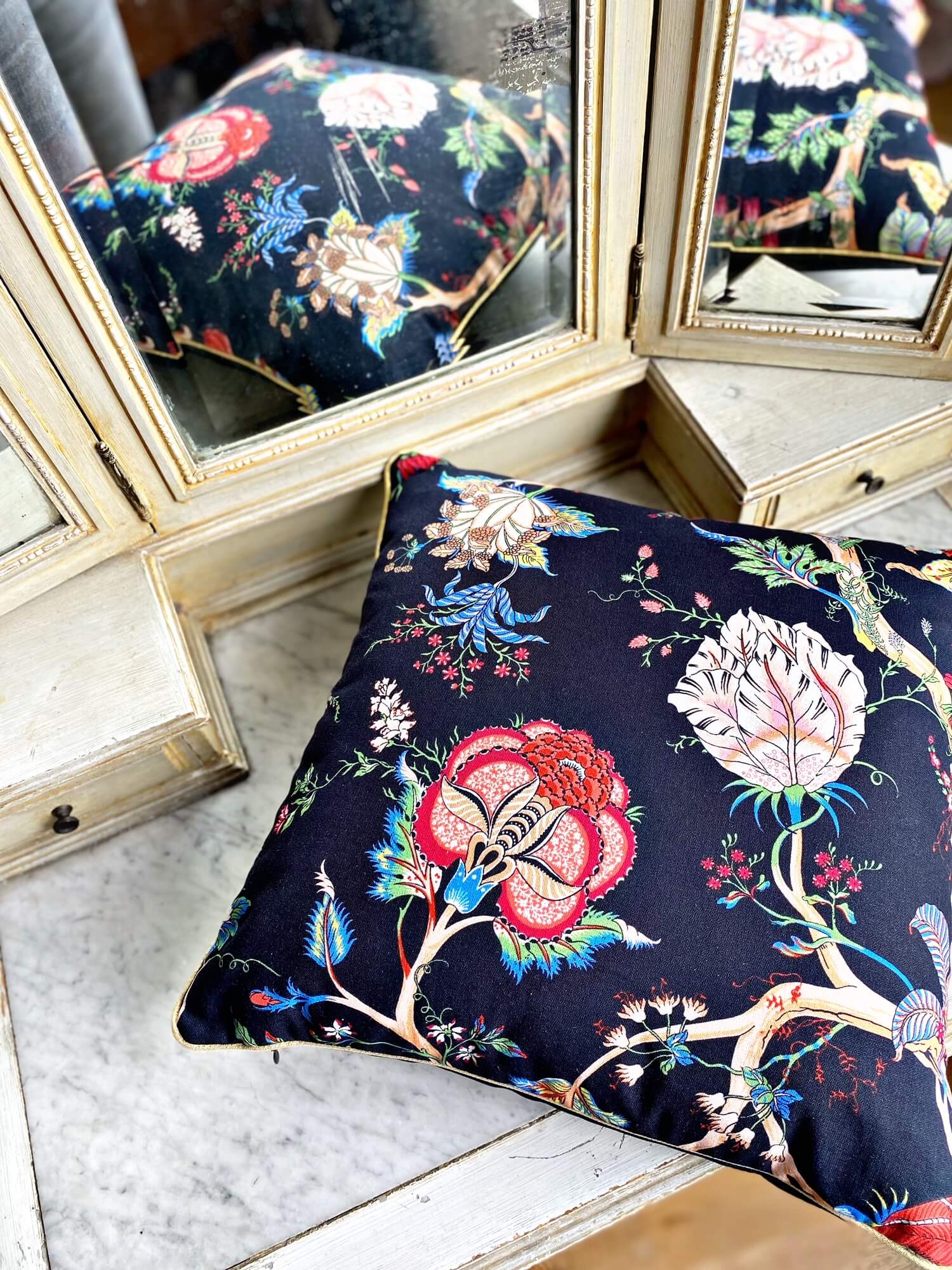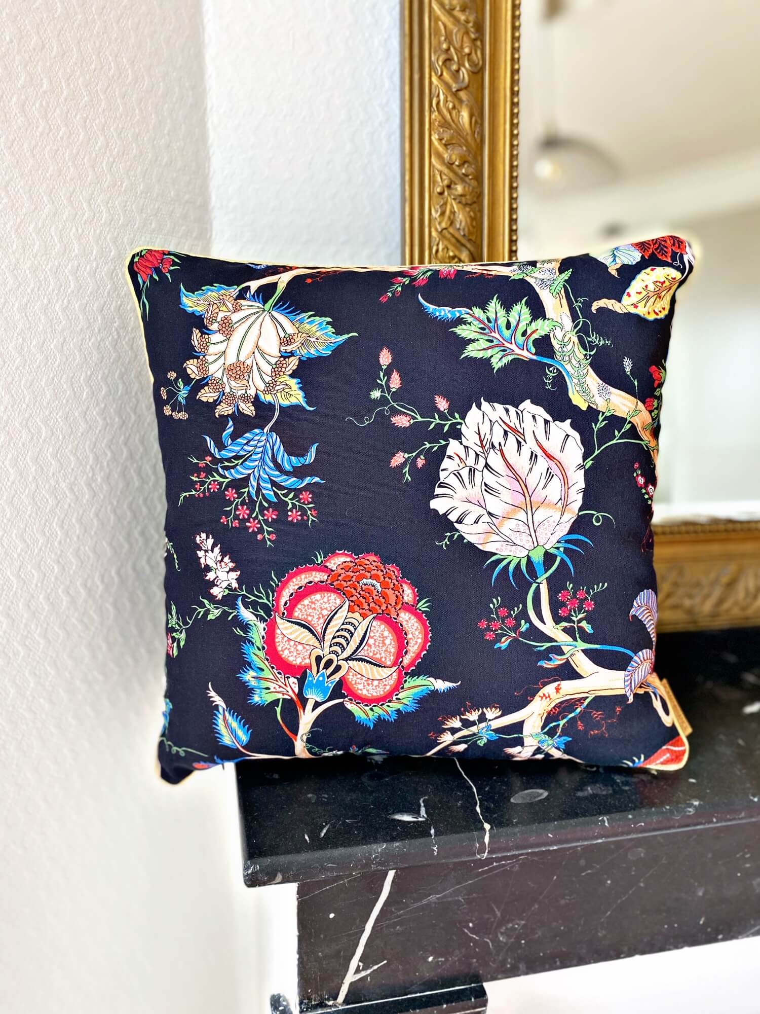 Craquez pour notre coussin NINON. Ces motifs floraux colorés sur un fond noir apporteront une touche de chaleur et d’exotisme à votre intérieur.