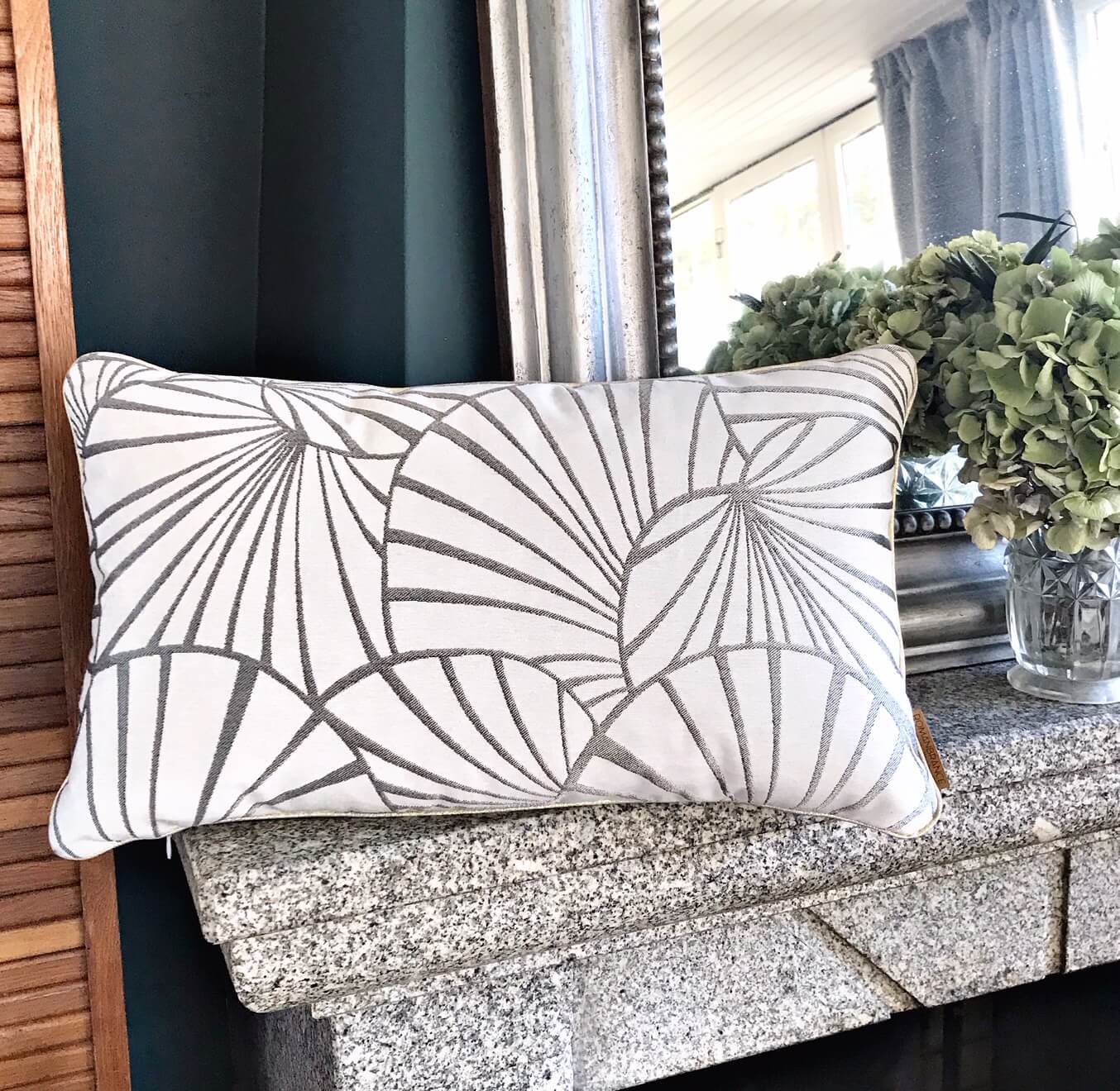 Voici un coussin à l’allure à la fois élégante et graphique. Craquez pour ce motif Nymphéa aux courbures grises argentées. Nous l’avons associer à un velours du même ton.