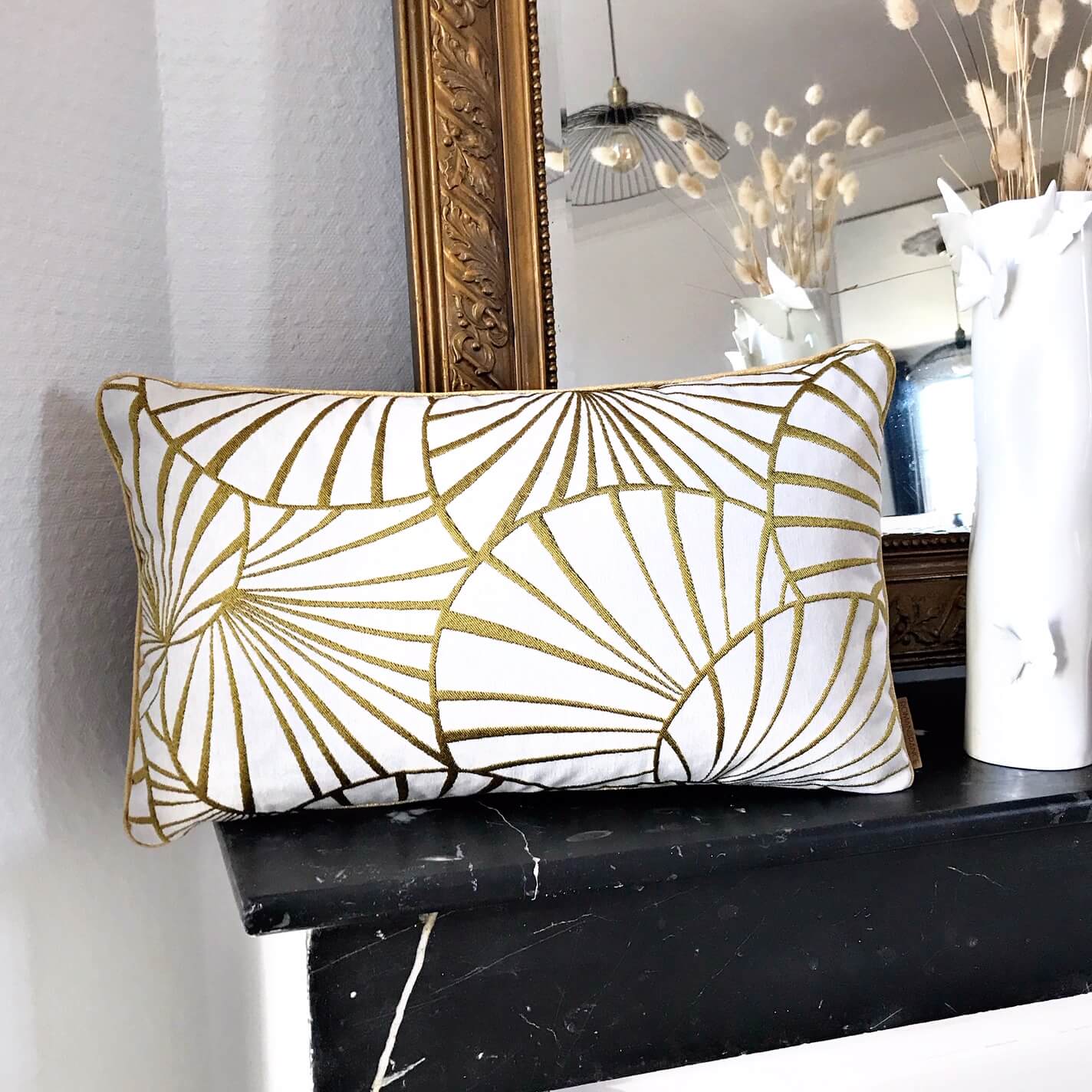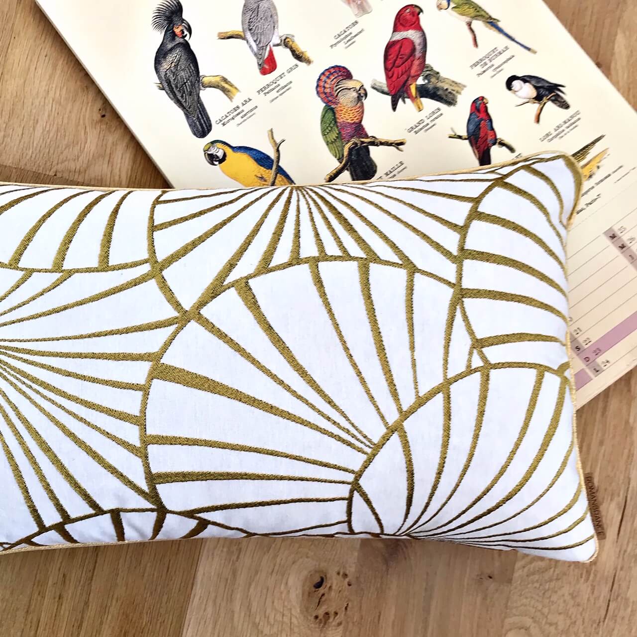 Voici un coussin à l’allure à la fois élégante et graphique. Craquez pour ce motif Nymphéa aux courbures mordorées sur fond crème.