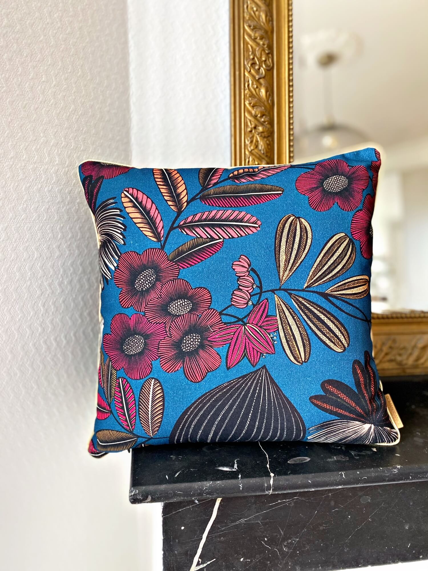 Ce coussin est joliment souligné d’un passepoil doré.