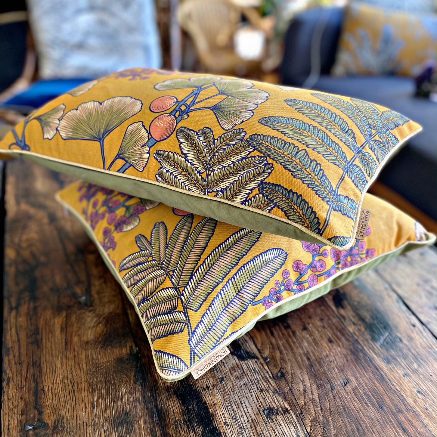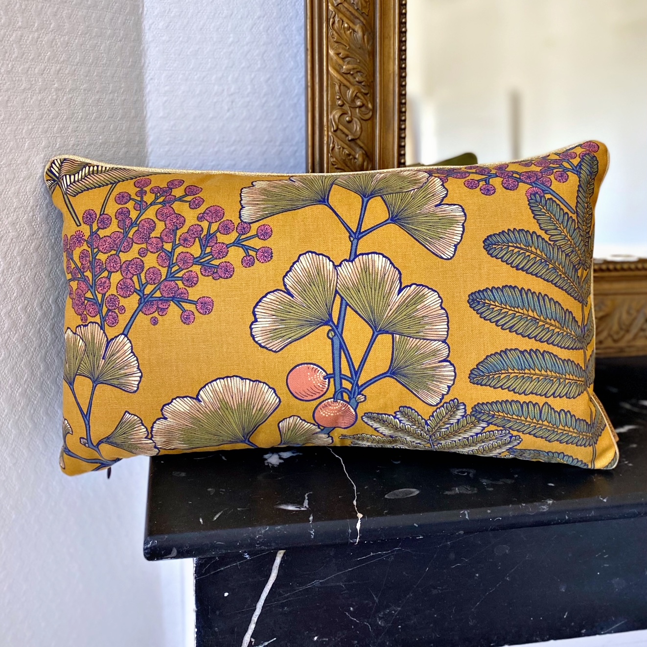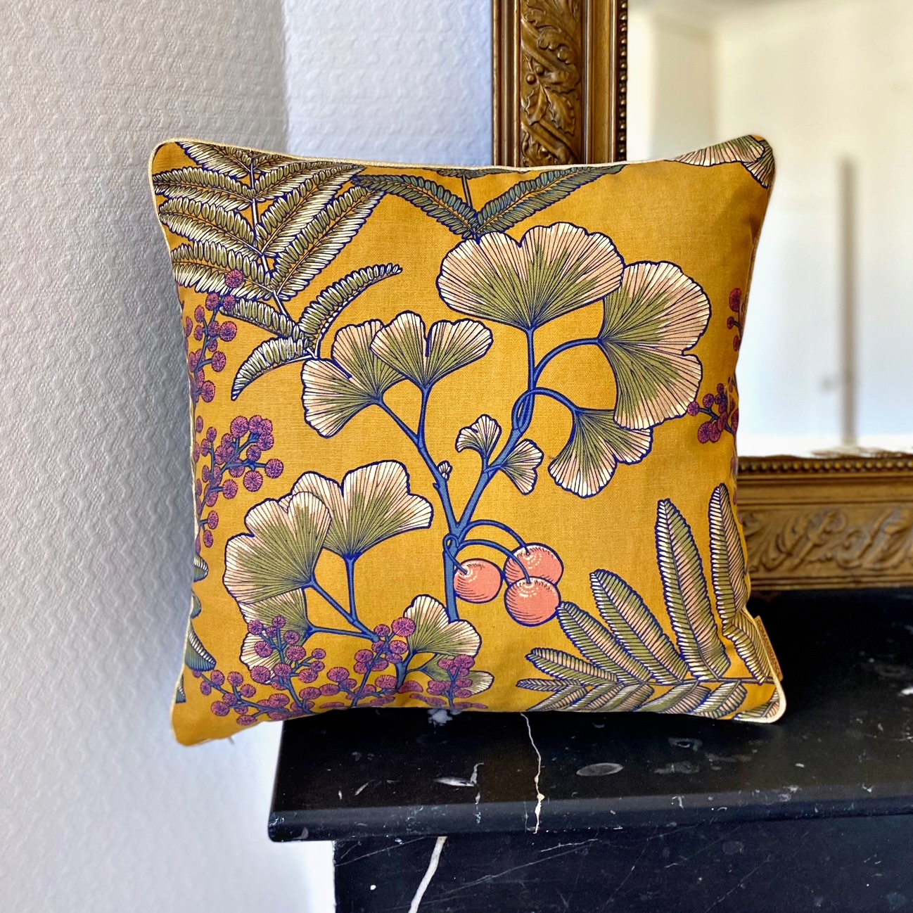 Avec ses fougères, ses feuilles de Ginkgo sur fond safran, ce nouveau coussin apportera chaleur et dynamisme à votre intérieur.
