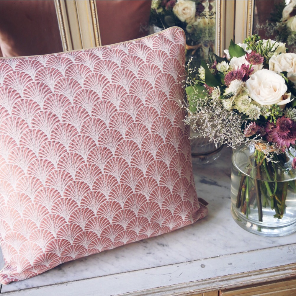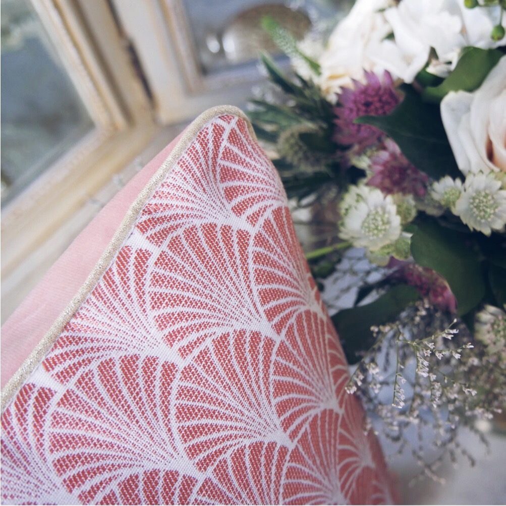 Côté tissus, ces éventails rose poudré sont en tissu jacquard et le verso est en velours rose ultra doux, très agréable au toucher et anti-tâches. Ce coussin est joliment souligné d’un passepoil doré.