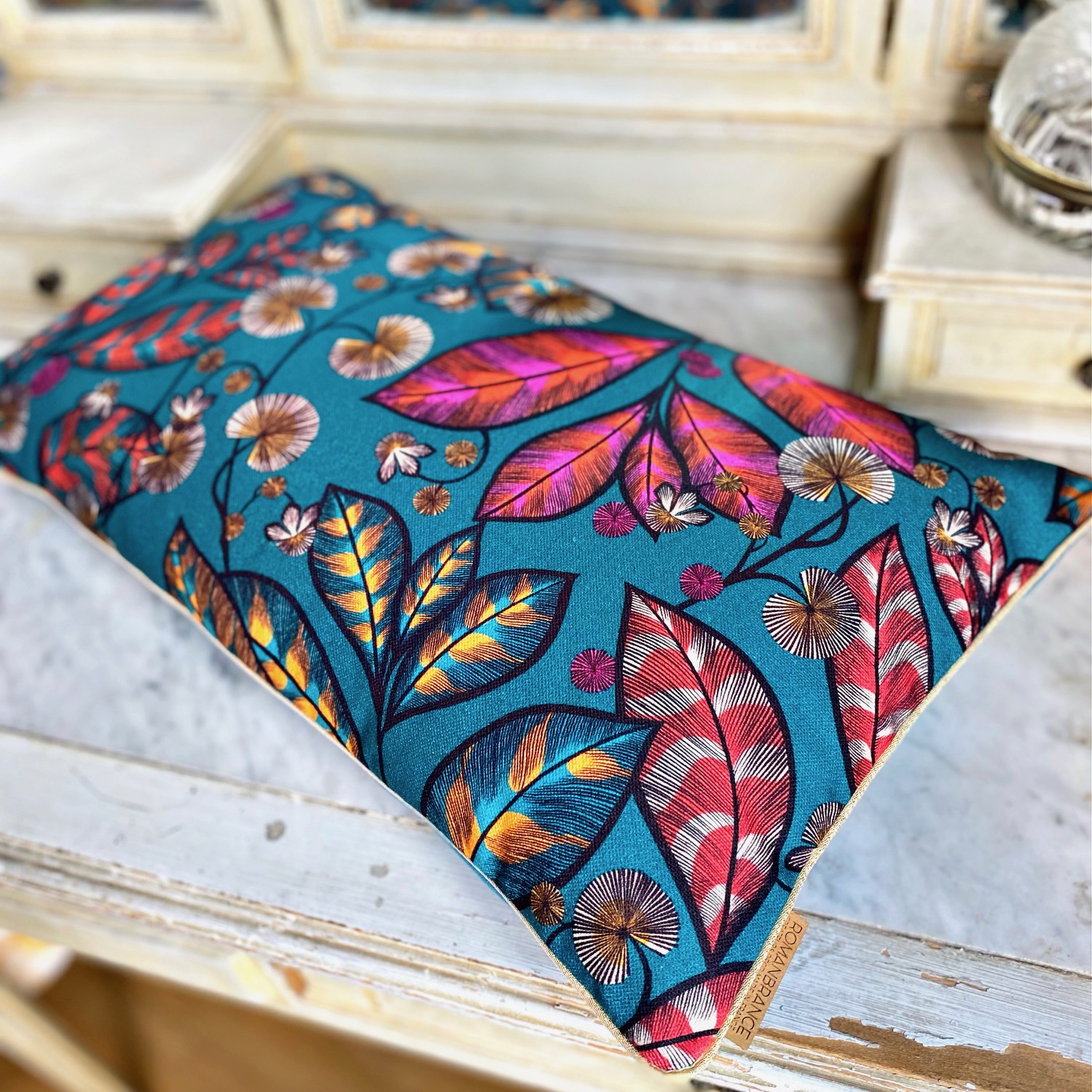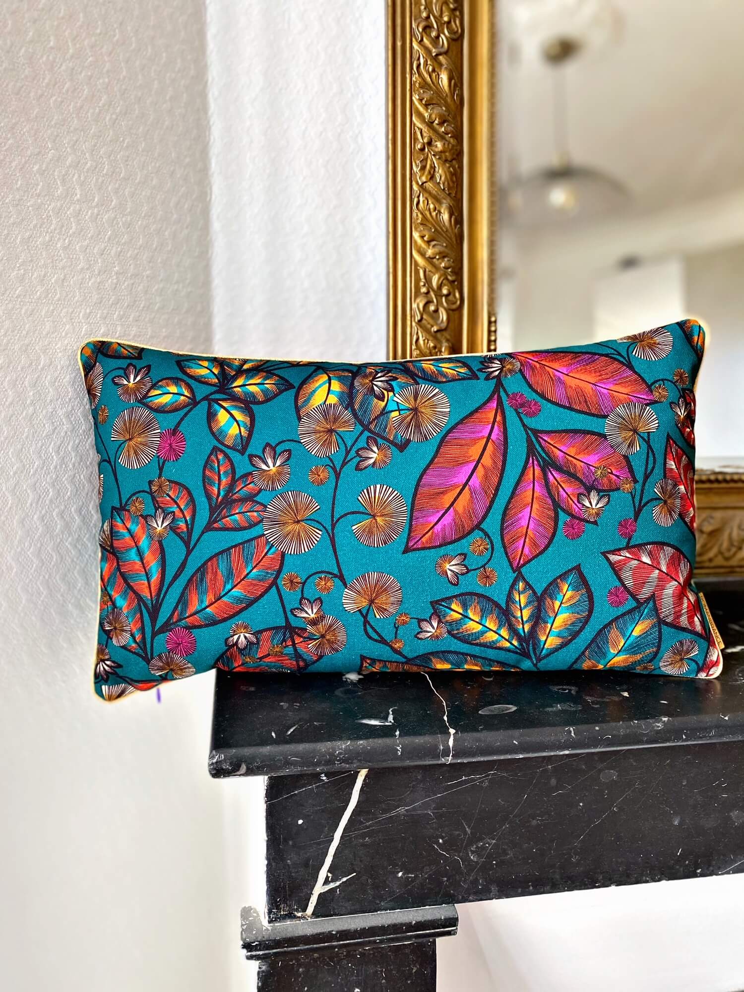 Le bleu canard s’invite sur votre canapé avec notre nouveau coussin SALMA. Ce magnifique tissu, composé de feuilles semblables à des plumes, et fleurs comme des flocons de pollen envoûtera votre intérieur. Nous avons choisi de l’associer un velours tout doux pour encore plus de confort.
