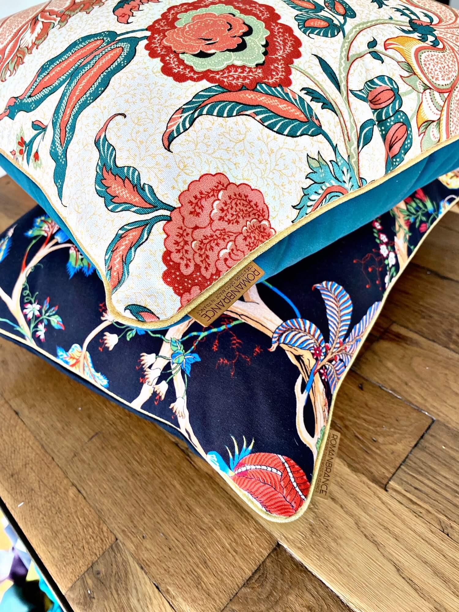 Chaque coussin est unique et le placement des motifs varie légèrement avec la représentation photographiée.