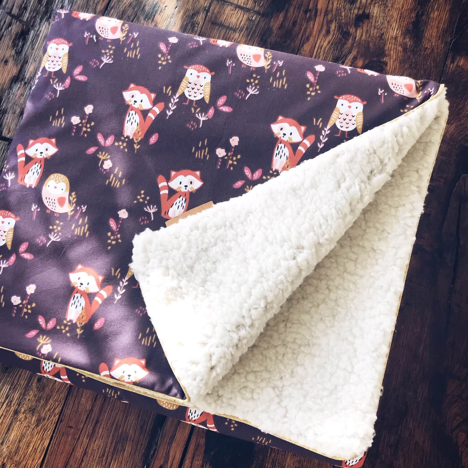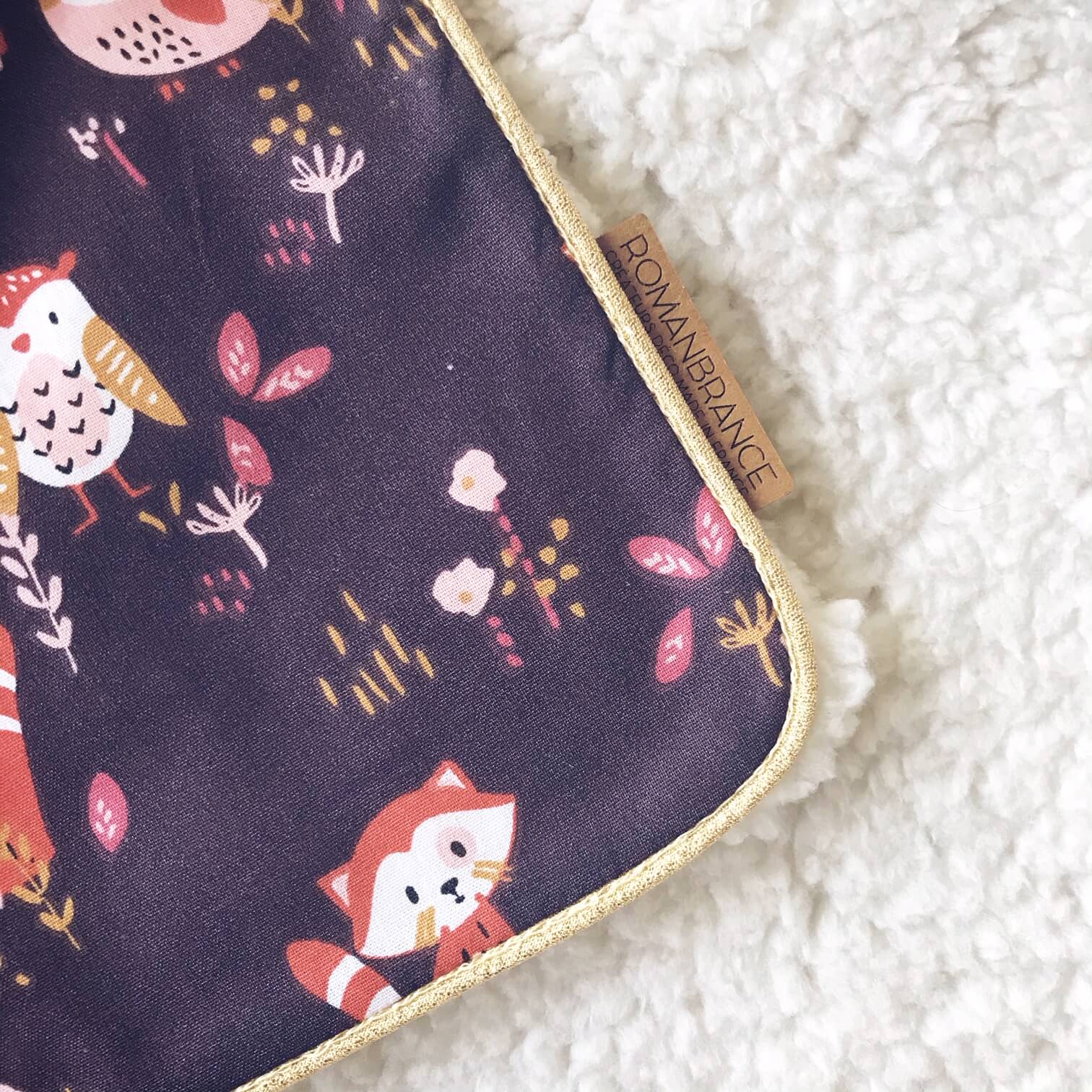 Elle est réalisée avec une face en coton et une face en sherpa tout doux, délicatement souligné d’un passepoil doré.