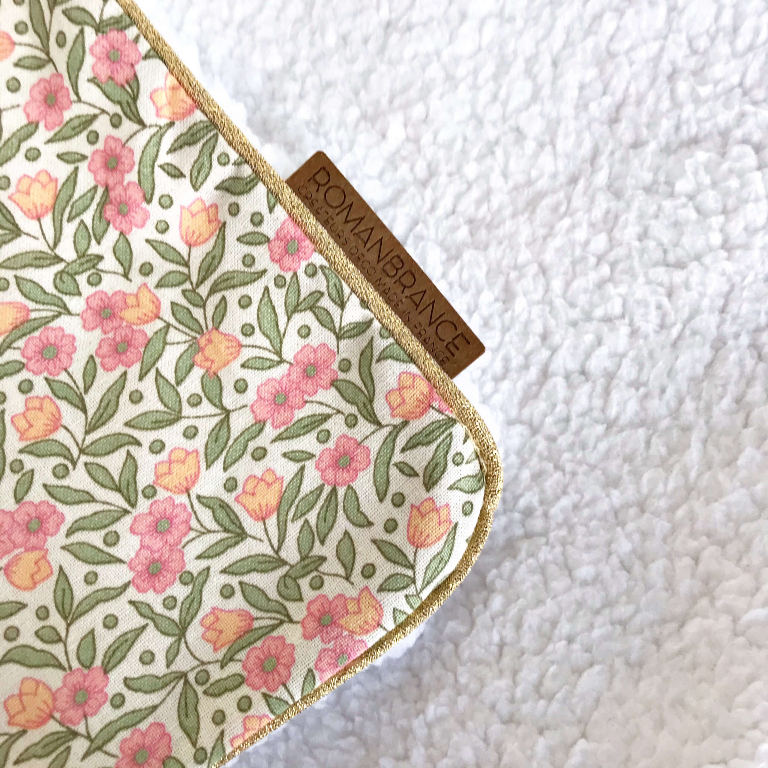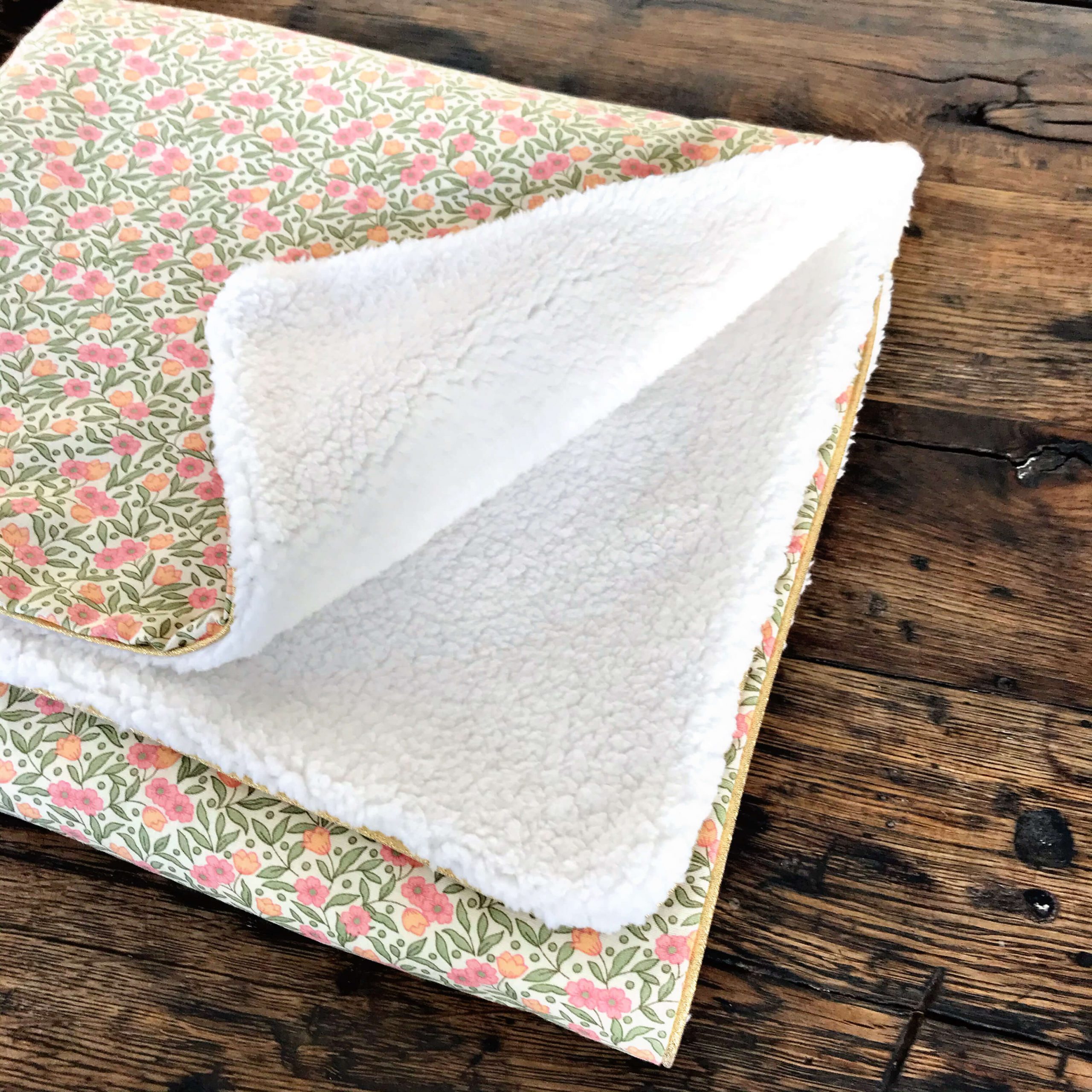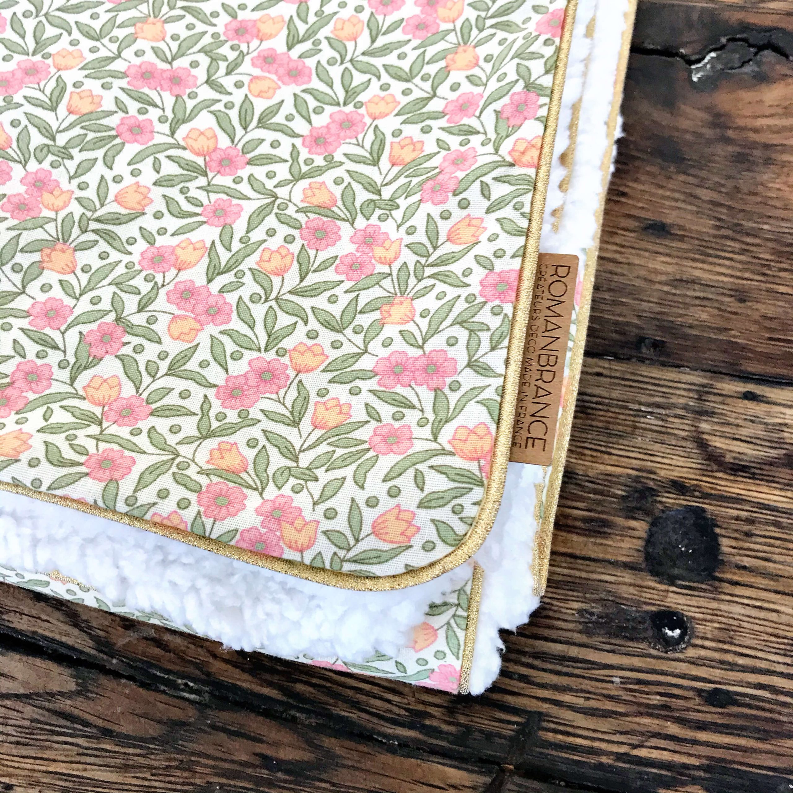 Elle est réalisée avec une face en coton et une face en sherpa tout doux, délicatement souligné d’un passepoil doré.