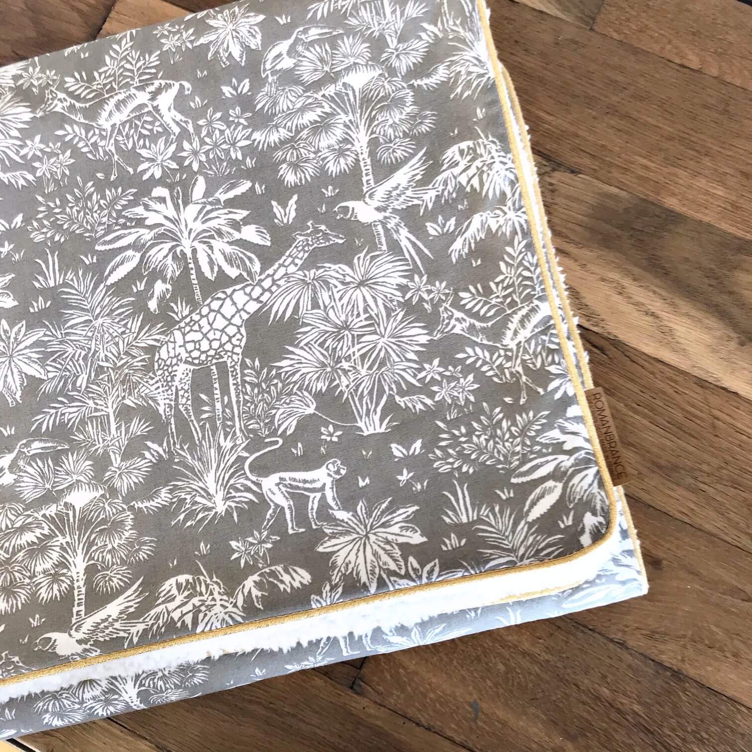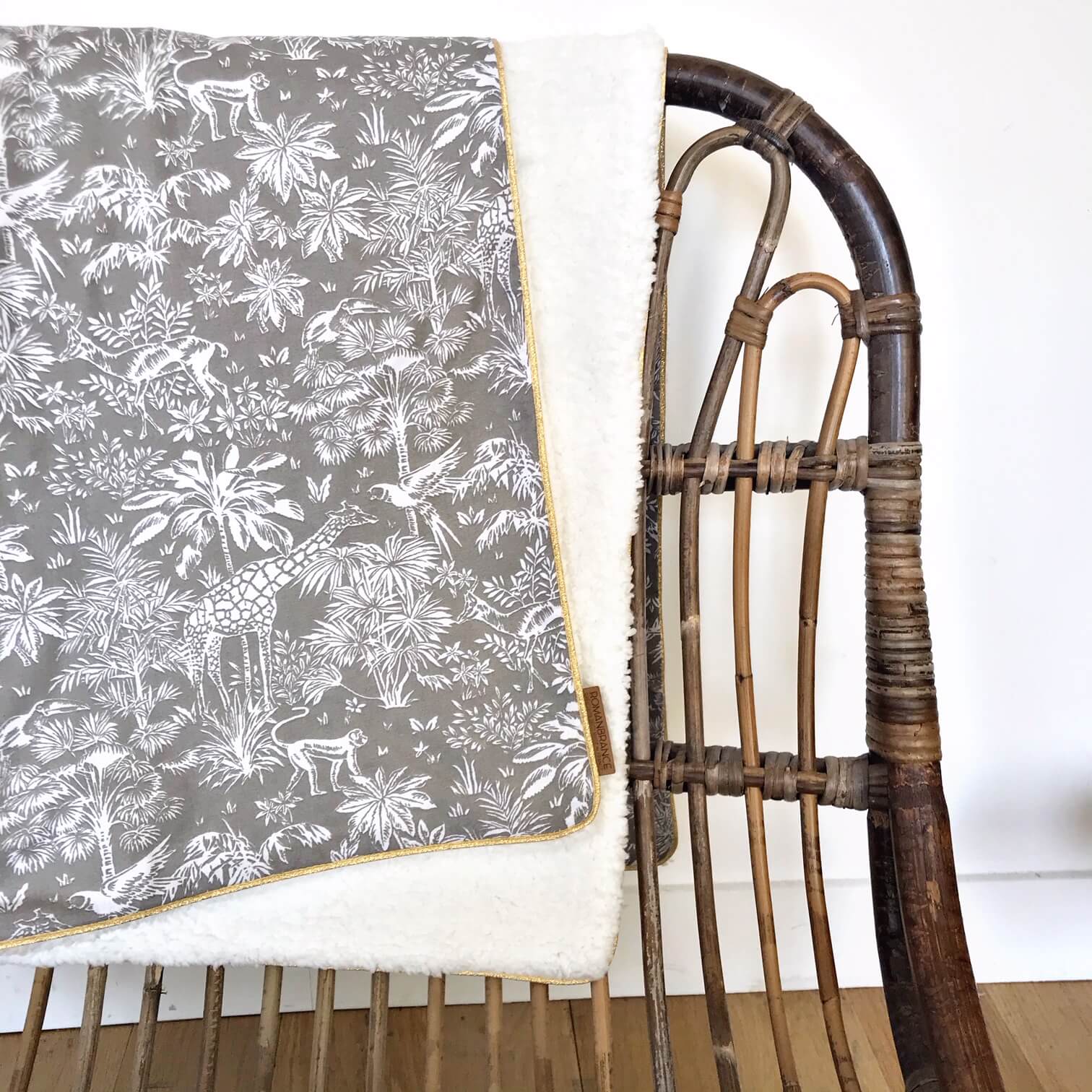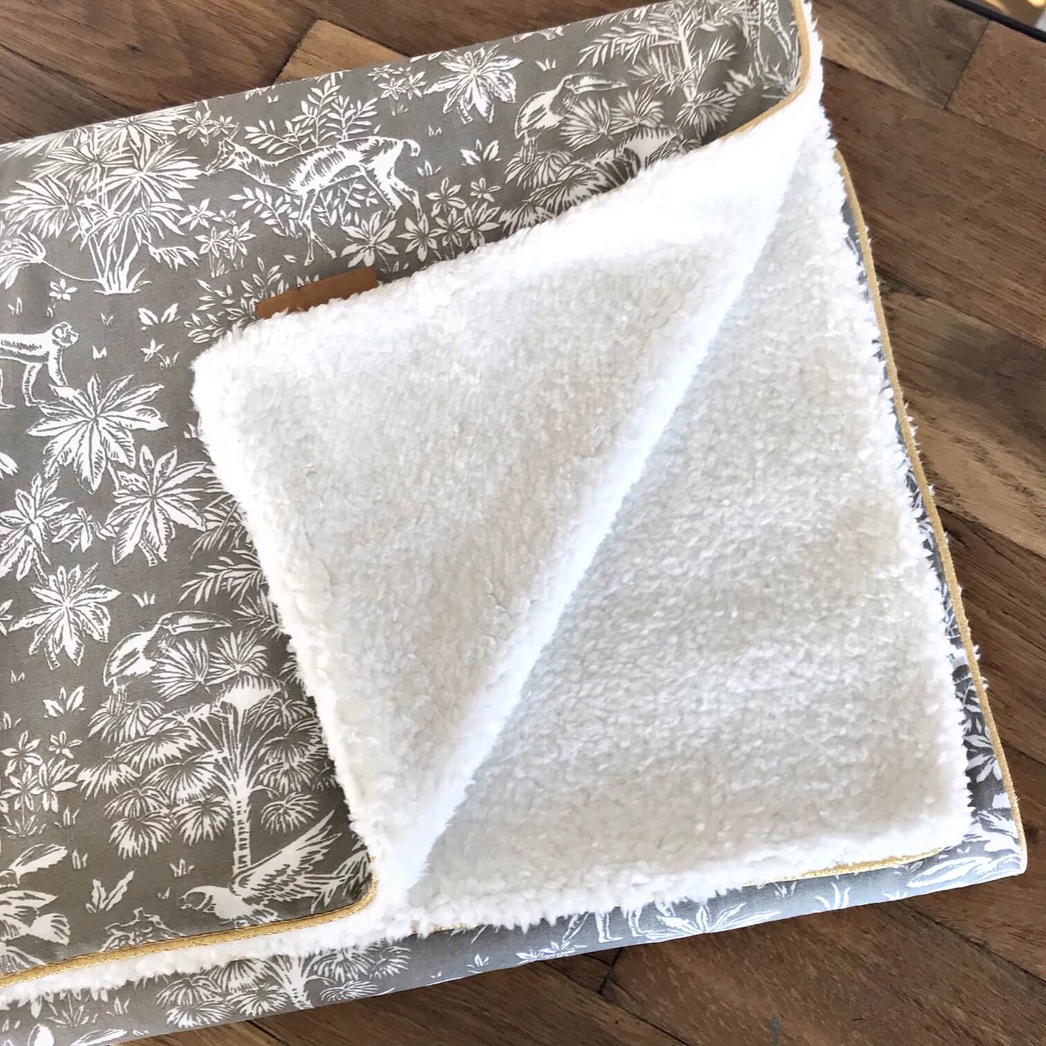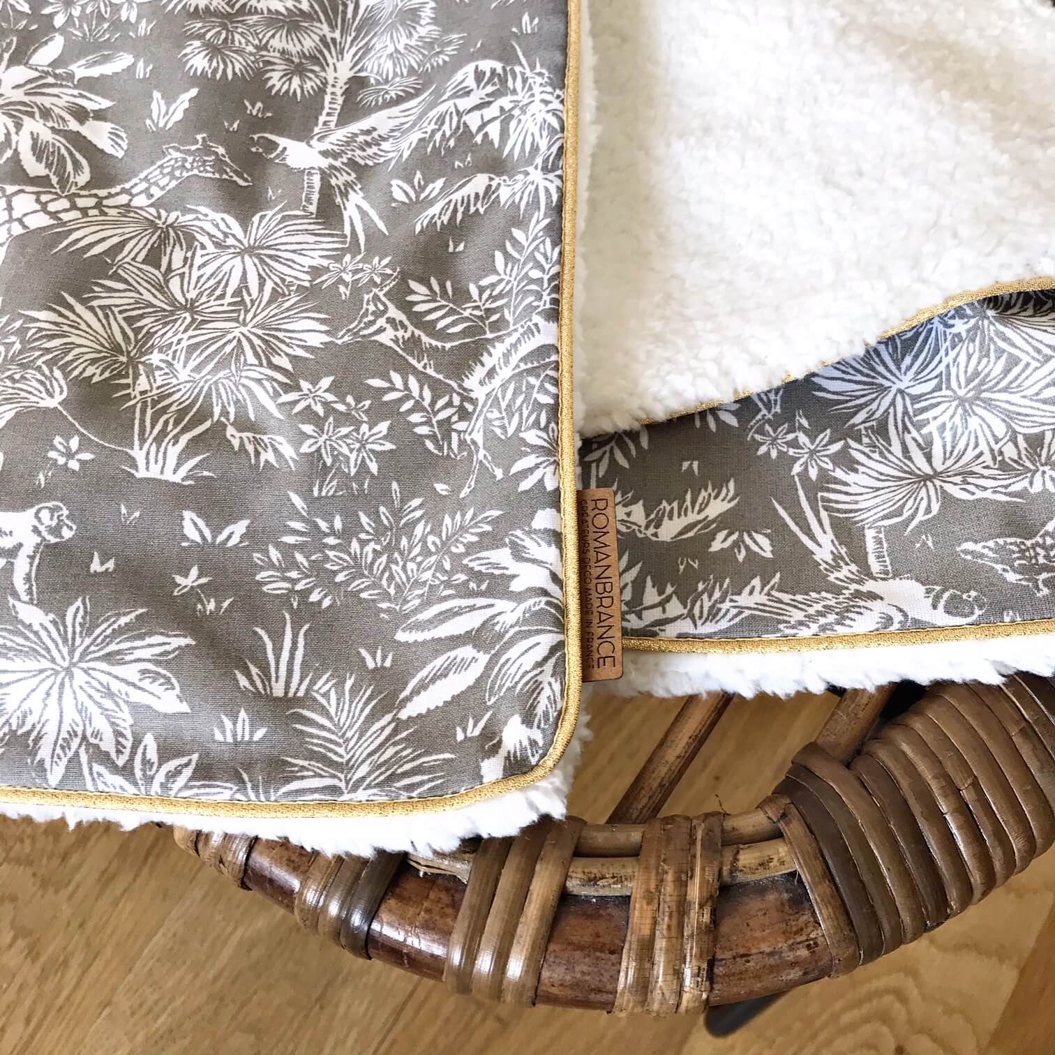 Elle est réalisée avec une face en coton et une face en sherpa tout doux, délicatement souligné d’un passepoil doré.