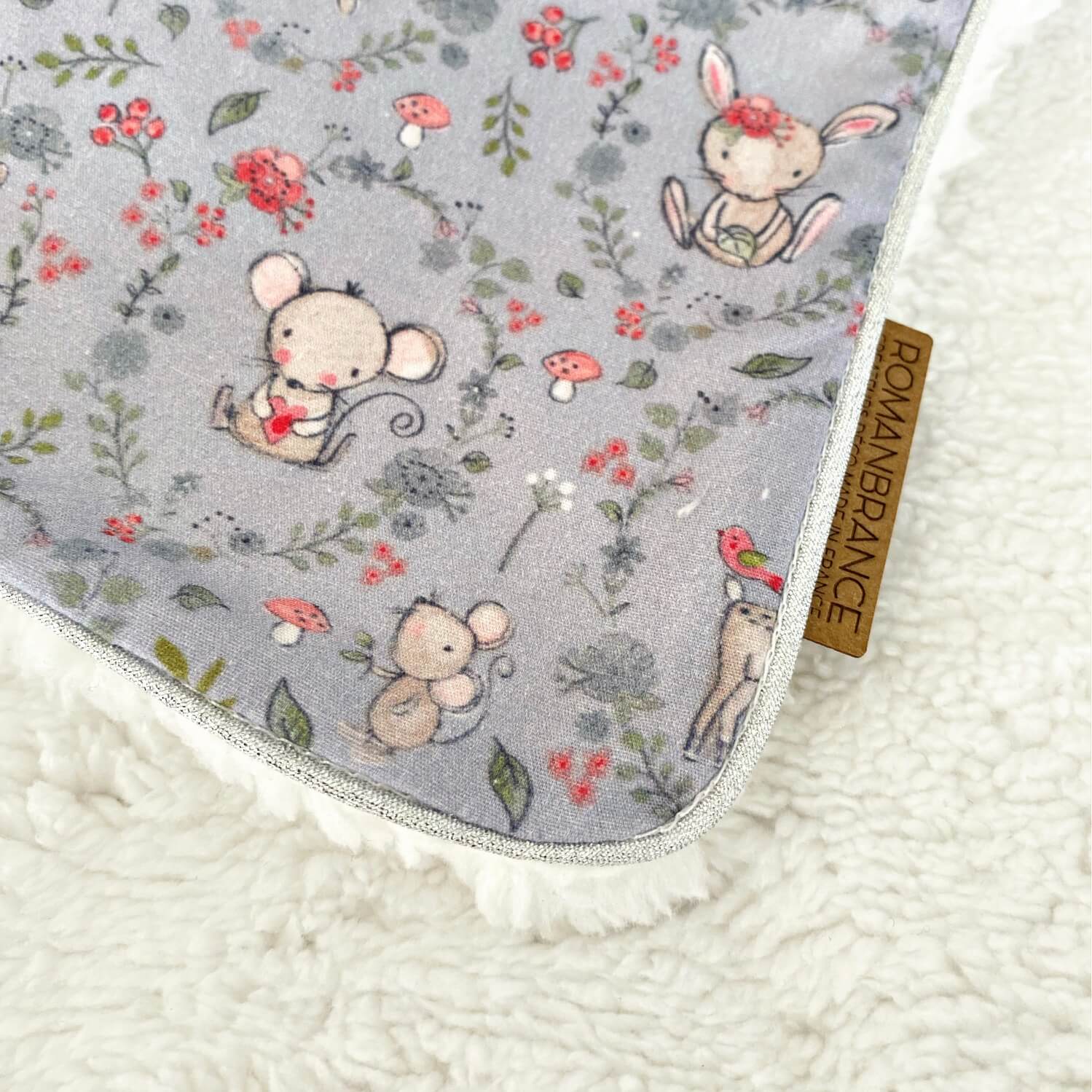 Elle est réalisée avec une face en coton et une face en sherpa tout doux, délicatement souligné d’un passepoil argenté.