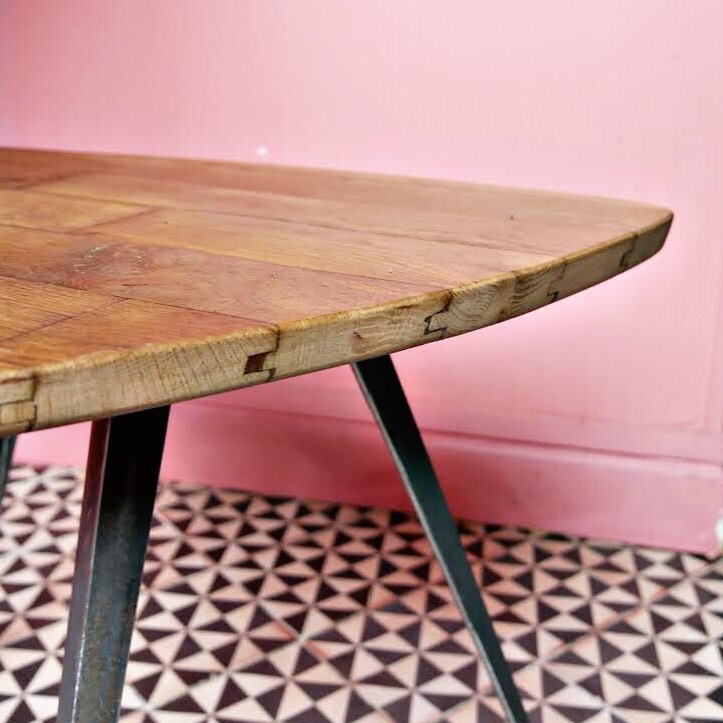Comme toutes nos créations, il est entièrement fait main et le bois est un ancien parquet en chêne massif recyclé et upcycle.