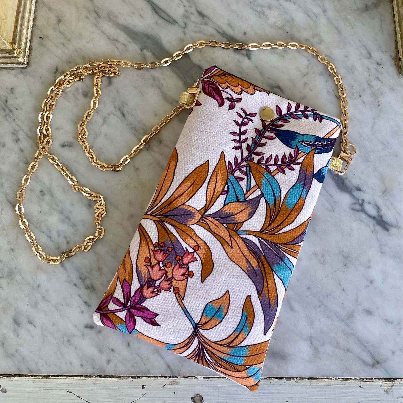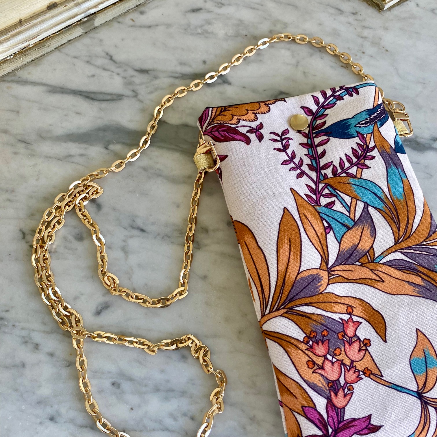 Voici une pochette qui deviendra très rapidement indispensable! Gardez à portée de main votre téléphone, vos lunettes ou autres… Sa bandoulière est une jolie chaine dorée non réglable mais amovible.