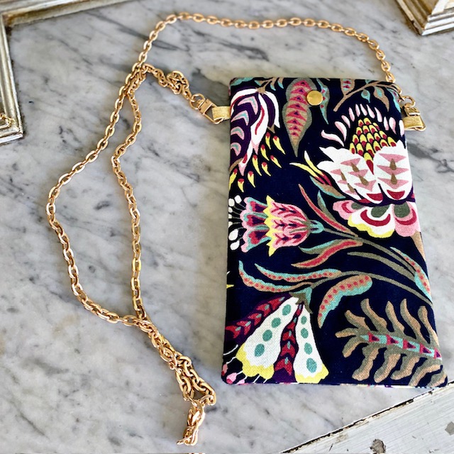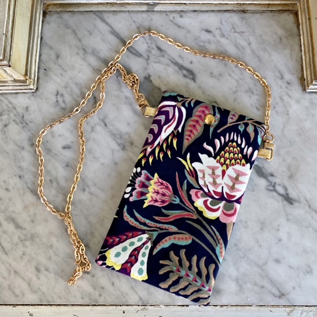 Voici une pochette qui deviendra très rapidement indispensable! Gardez à portée de main votre téléphone, vos lunettes ou autres… Sa bandoulière est une jolie chaine dorée non réglable mais amovible.