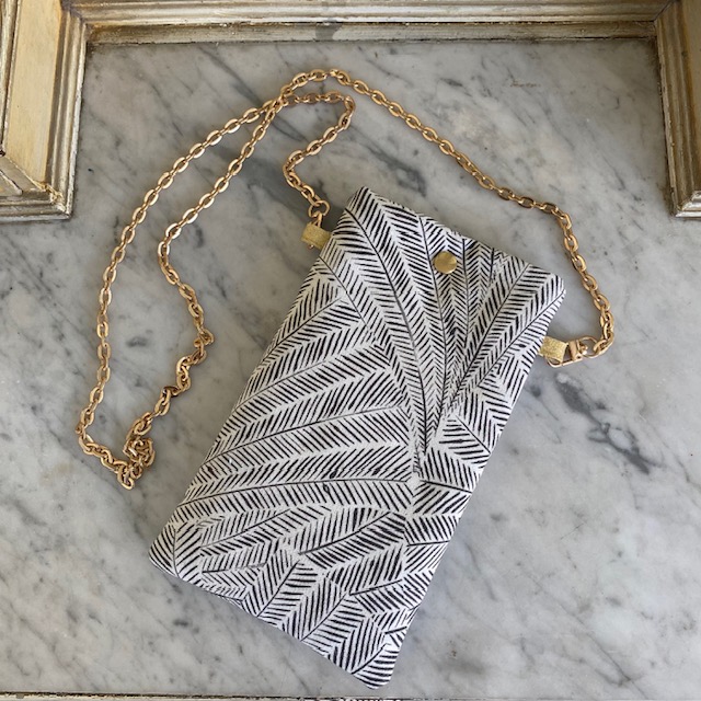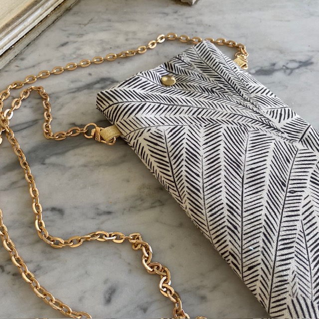 Voici une pochette qui deviendra très rapidement indispensable! Gardez à portée de main votre téléphone, vos lunettes ou autres… Sa bandoulière est une jolie chaine dorée non réglable mais amovible.