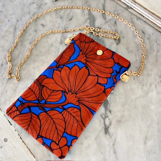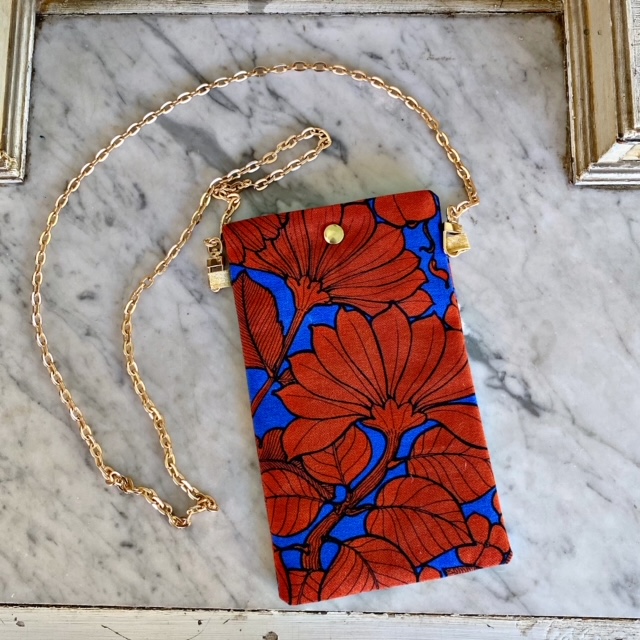 Voici une pochette qui deviendra très rapidement indispensable! Gardez à portée de main votre téléphone, vos lunettes ou autres… Sa bandoulière est une jolie chaine dorée non réglable mais amovible.