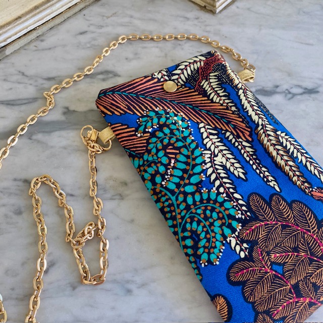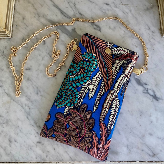 Voici une pochette qui deviendra très rapidement indispensable! Gardez à portée de main votre téléphone, vos lunettes ou autres… Sa bandoulière est une jolie chaine dorée non réglable mais amovible.