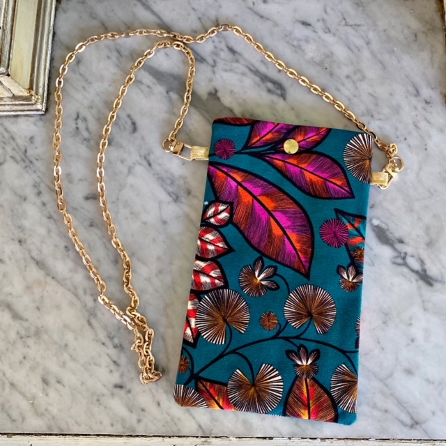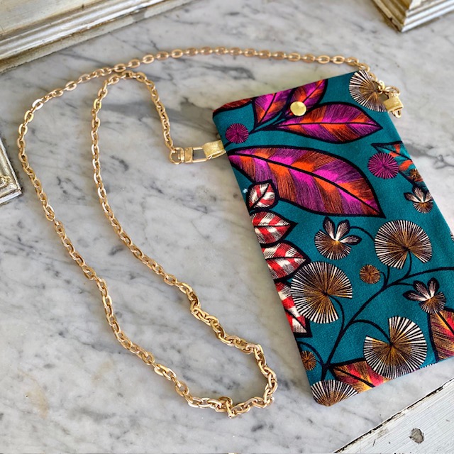 Voici une pochette qui deviendra très rapidement indispensable! Gardez à portée de main votre téléphone, vos lunettes ou autres… Sa bandoulière est une jolie chaine dorée non réglable mais amovible.
