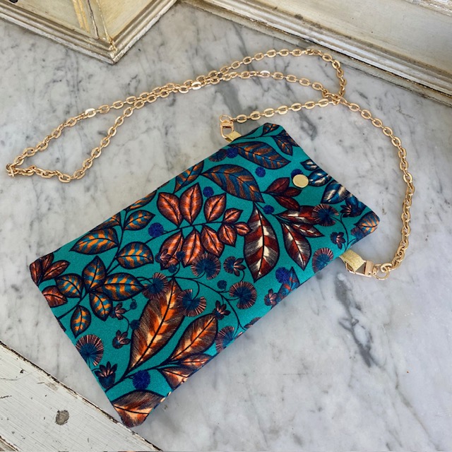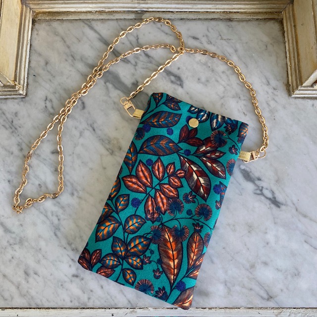 Voici une pochette qui deviendra très rapidement indispensable! Gardez à portée de main votre téléphone, vos lunettes ou autres… Sa bandoulière est une jolie chaine dorée non réglable mais amovible.