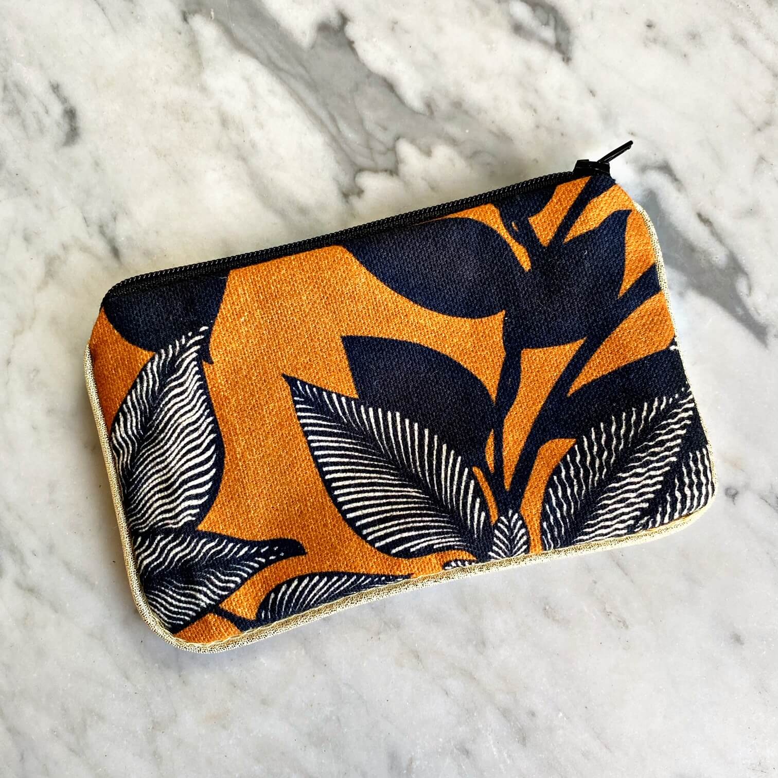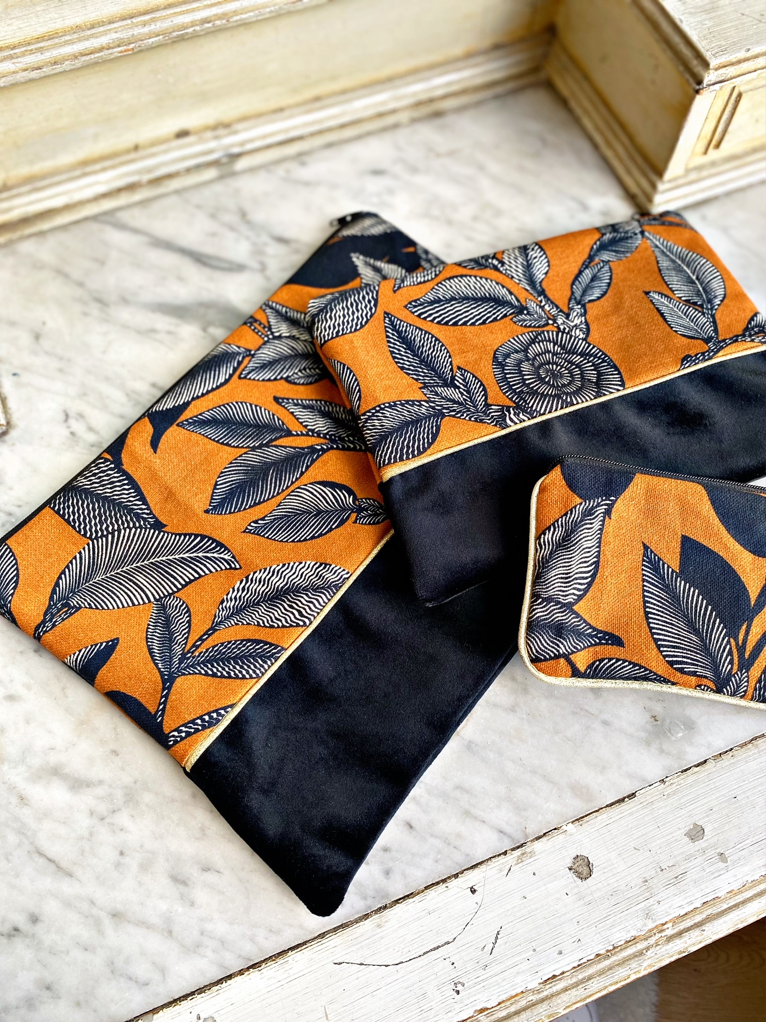 Mêmes finitions que nos coussins, une face tissus et une face velours souligné d’un joli passepoil doré.