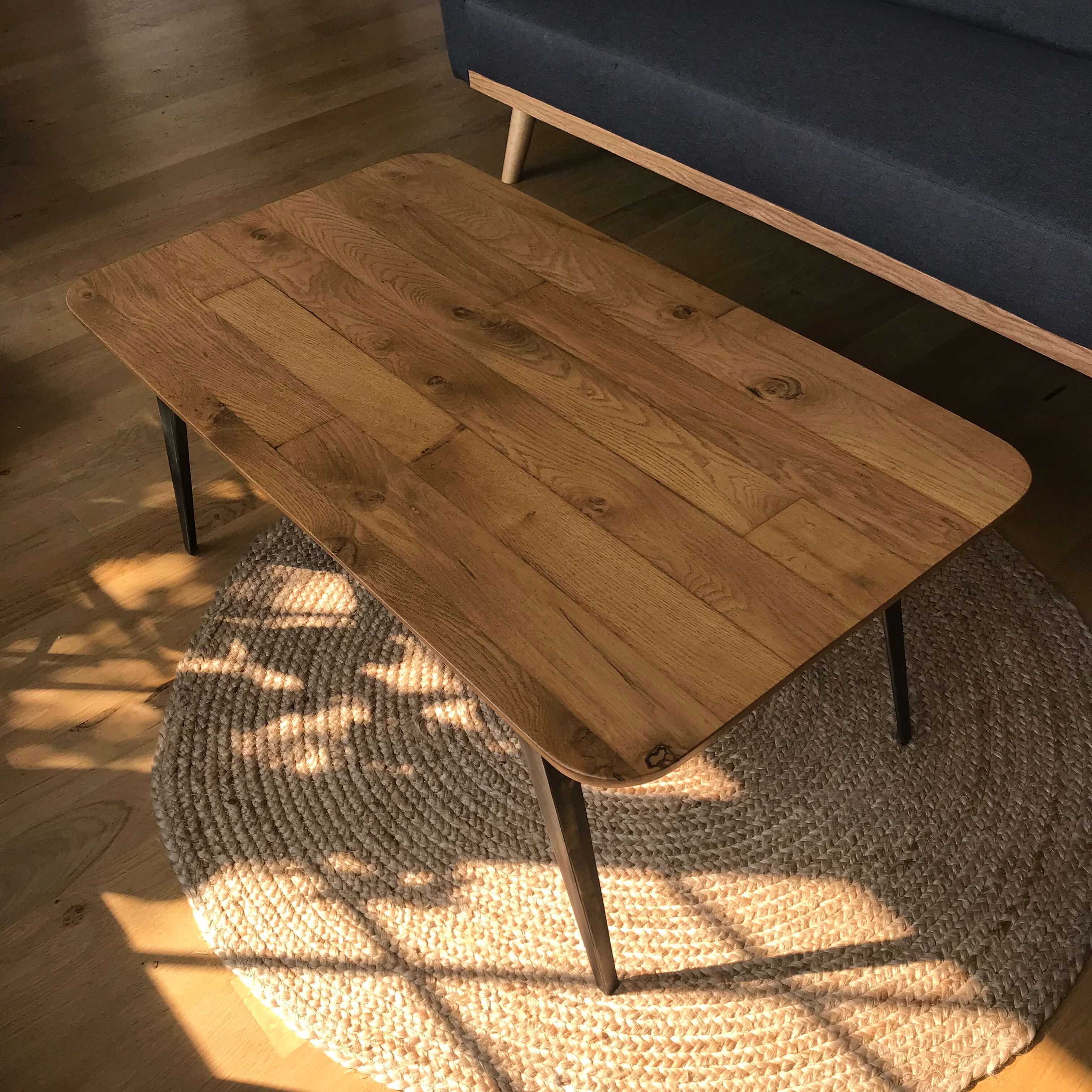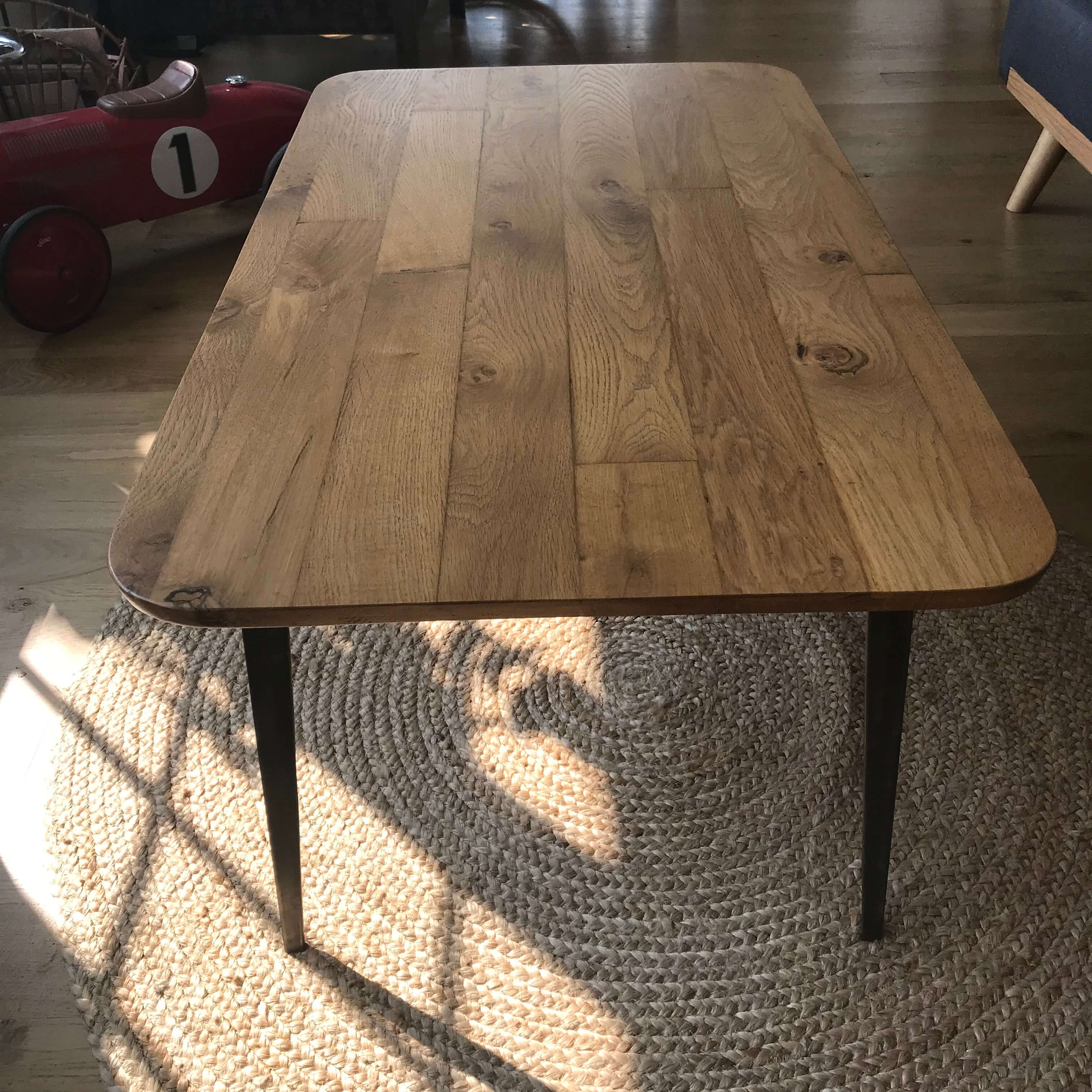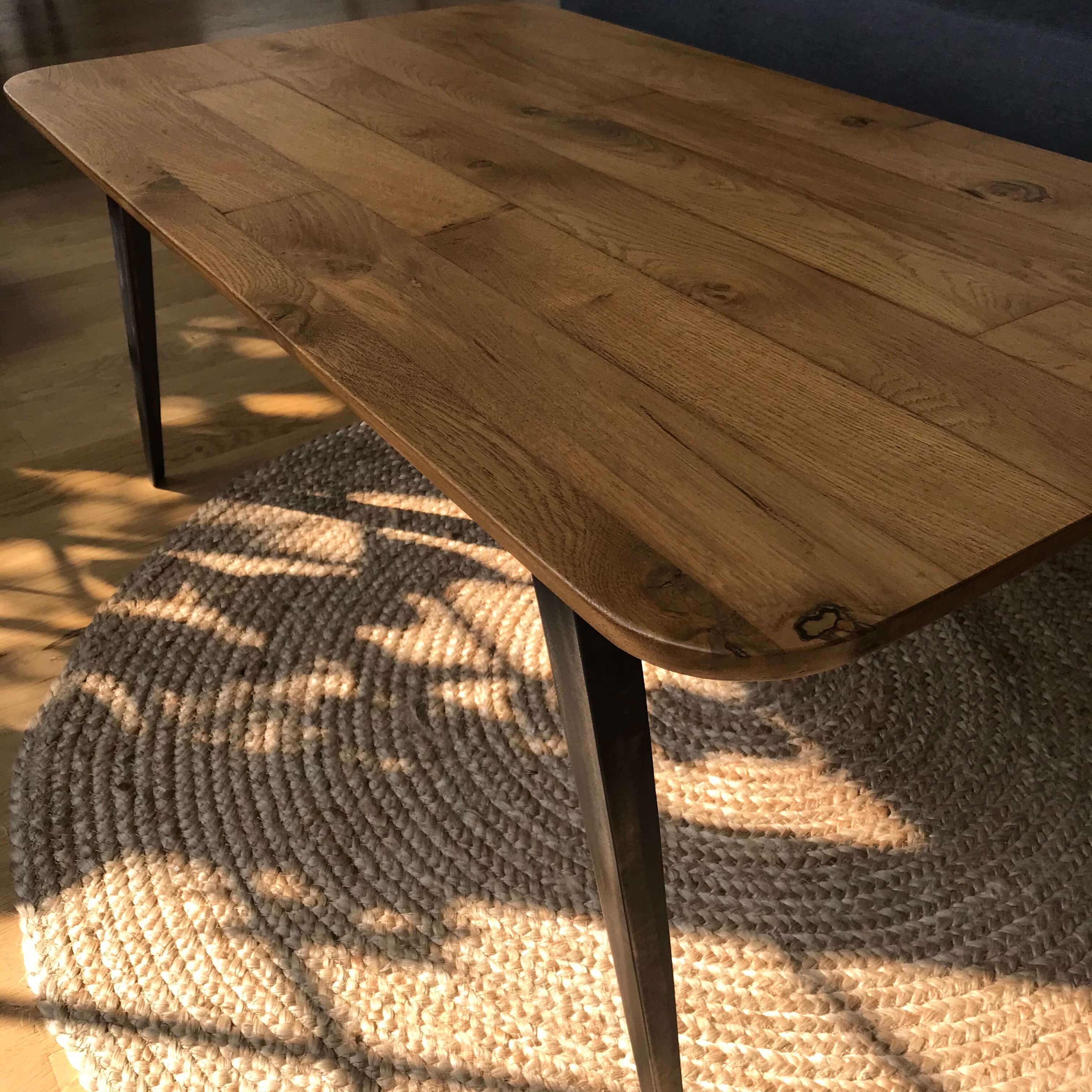 Le plateau est brut et laisse apparaître l’épaisseur du bois. Une huile de protection a été déposée mais aucun vernis afin de laisser la couleur originale du chêne vieilli par le temps.