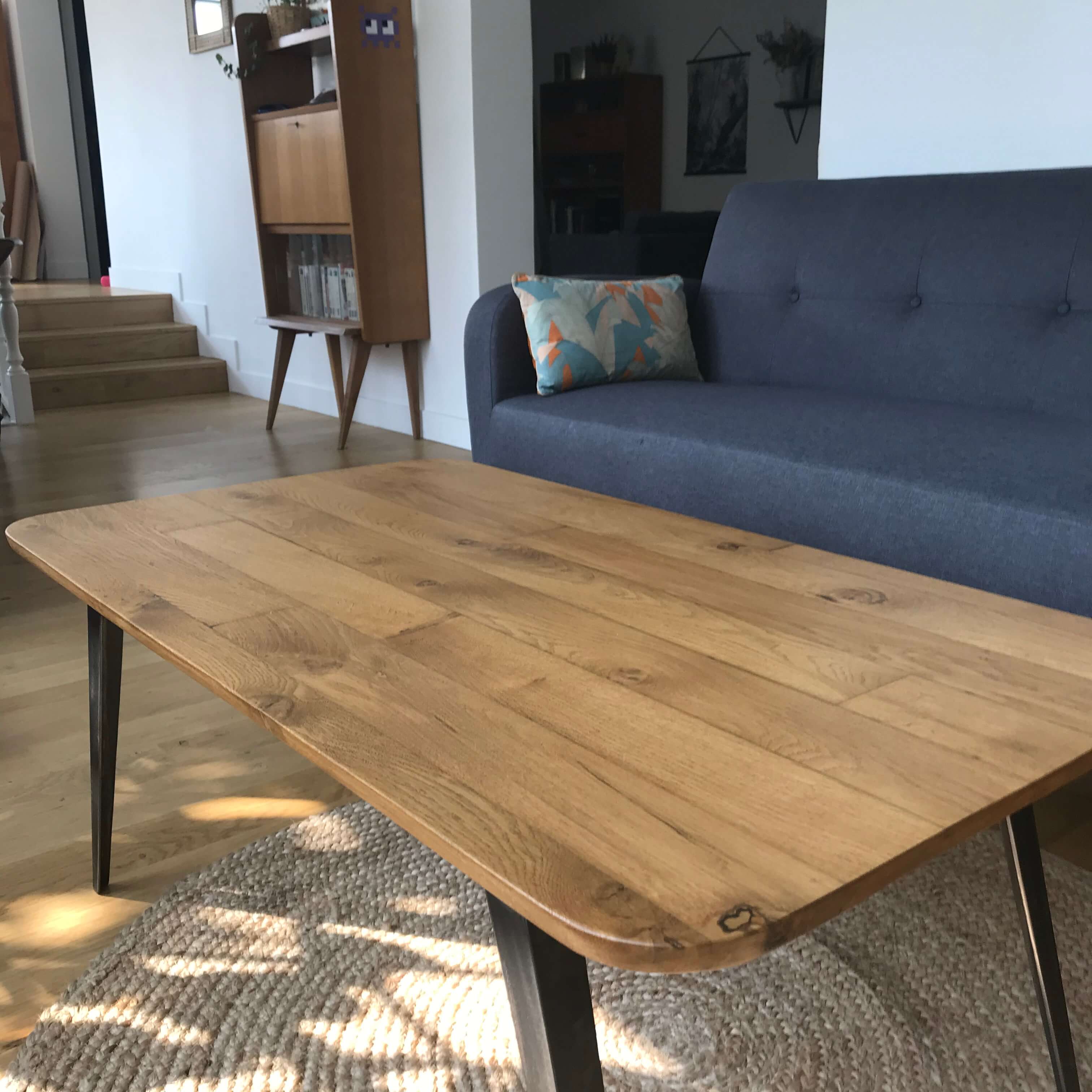 Entièrement faite main, elle est réalisée en acier et chêne massif. Le bois de son plateau provient d’un ancien parquet parisien recyclé et up’cyclé.