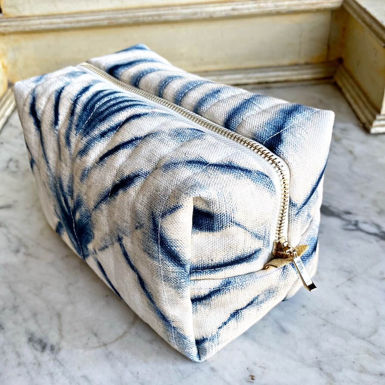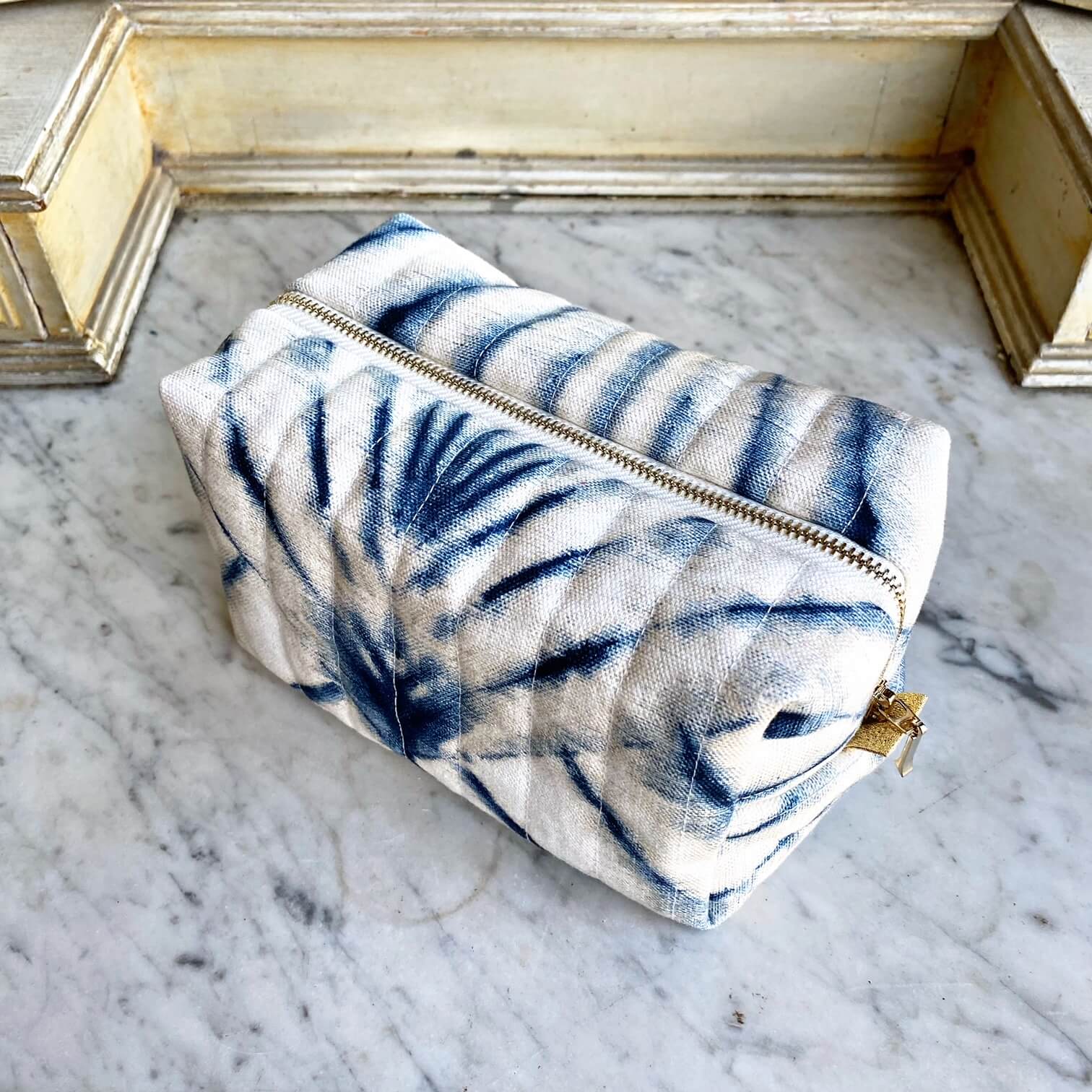 Tissu en coton matelassé à la main. Fermeture dorée et doublure intérieur en coton crème.